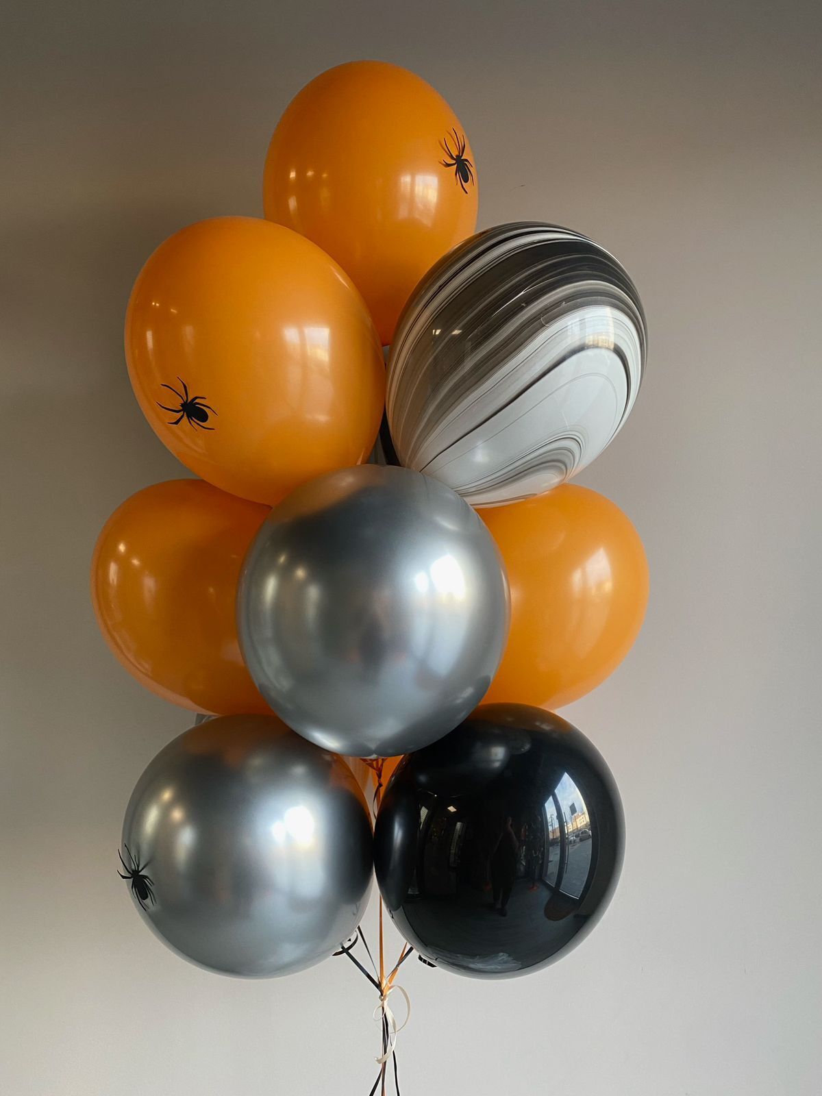• Фонтан 13 шаров (2 агата, 2 хром серебро, 9 обычных в черно-оранжевой гамме, 3 наклейки "паук")