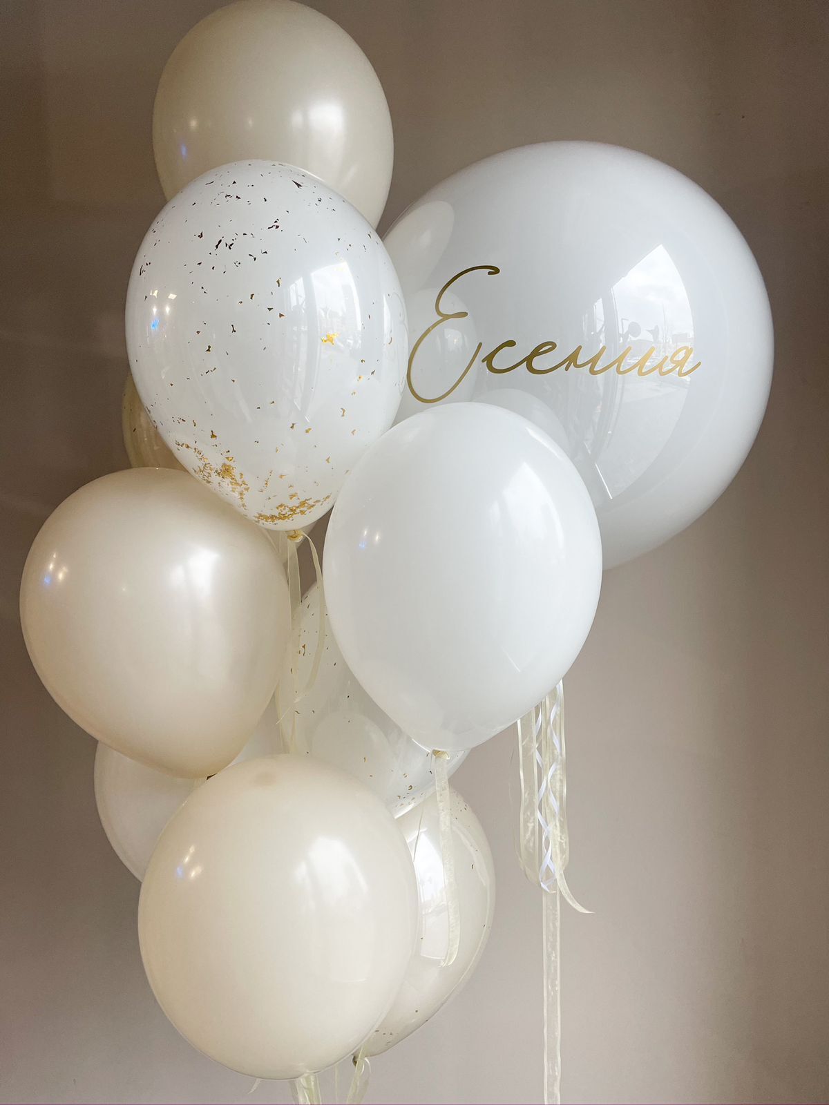 • Фонтан из 9 шаров (2 белых дабл Стафф с конфетти, 2 белый песок дабл Стафф с конфетти, 3 белый песок, 2 белых)