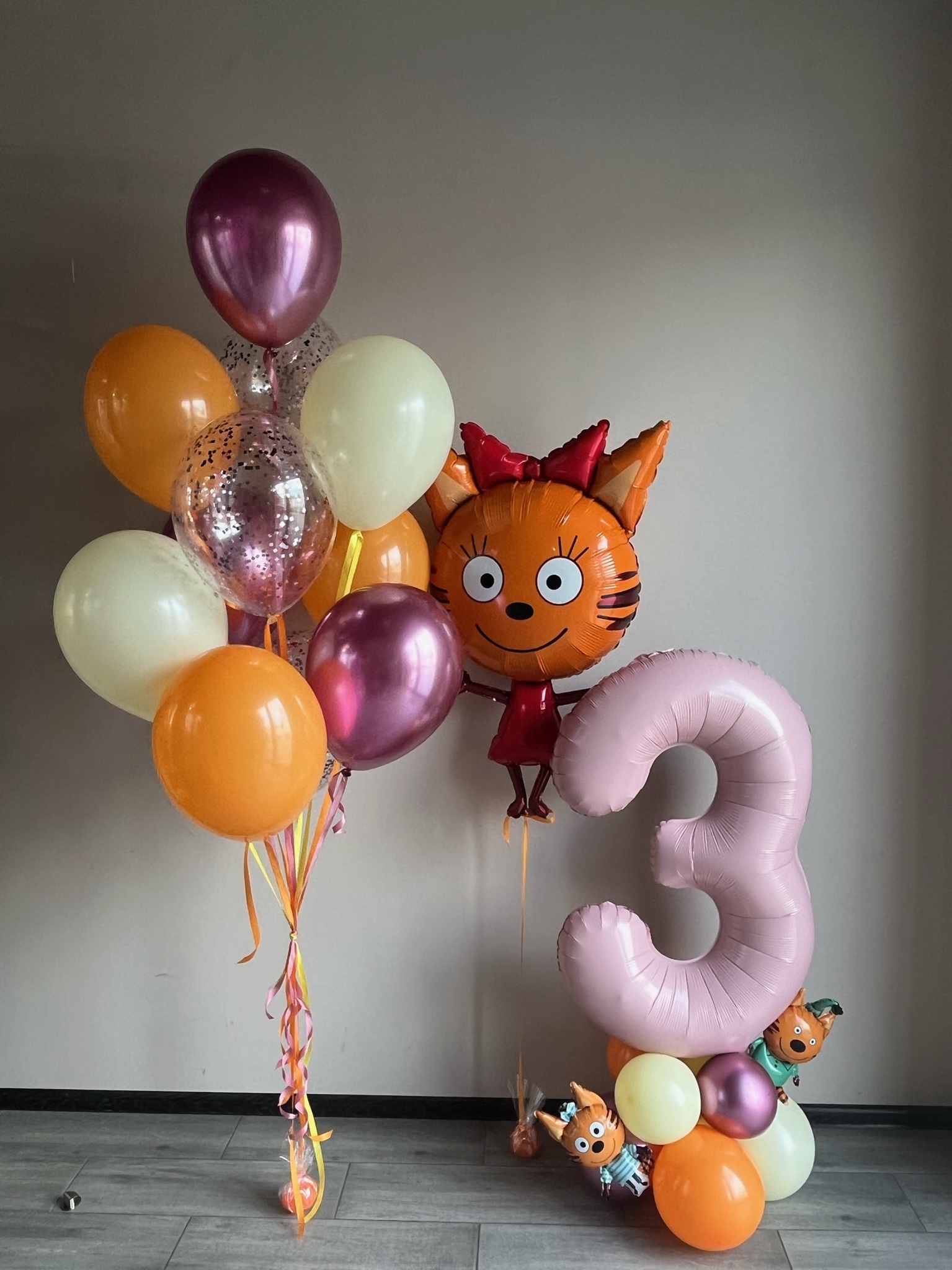 Фонтан из: 3 хром, 3 с конфетти, 5 обычных  - на атласных лентах