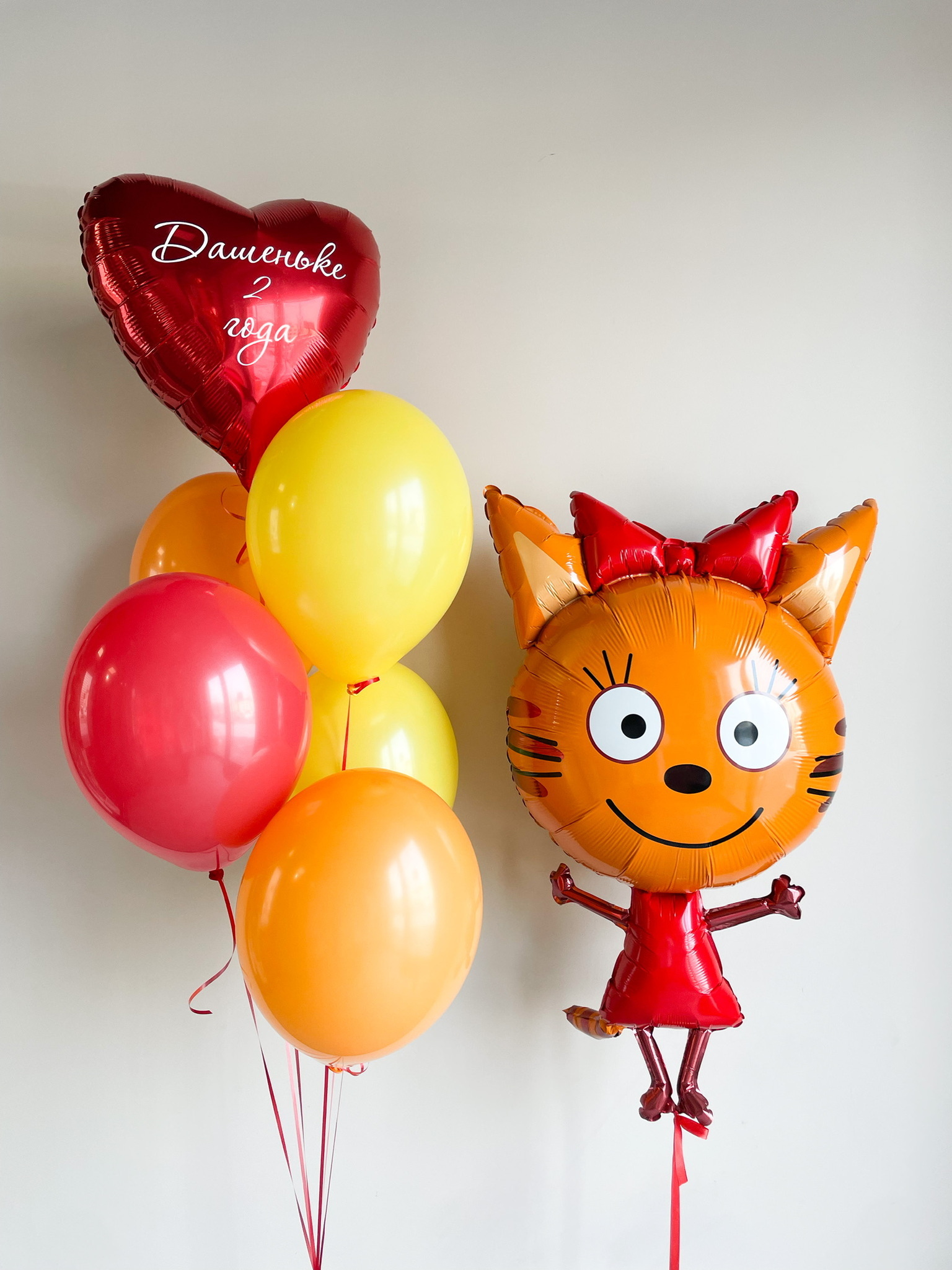- Фонтан из 6 шаров: сердце с индивидуальной надписью и 5 однотонных