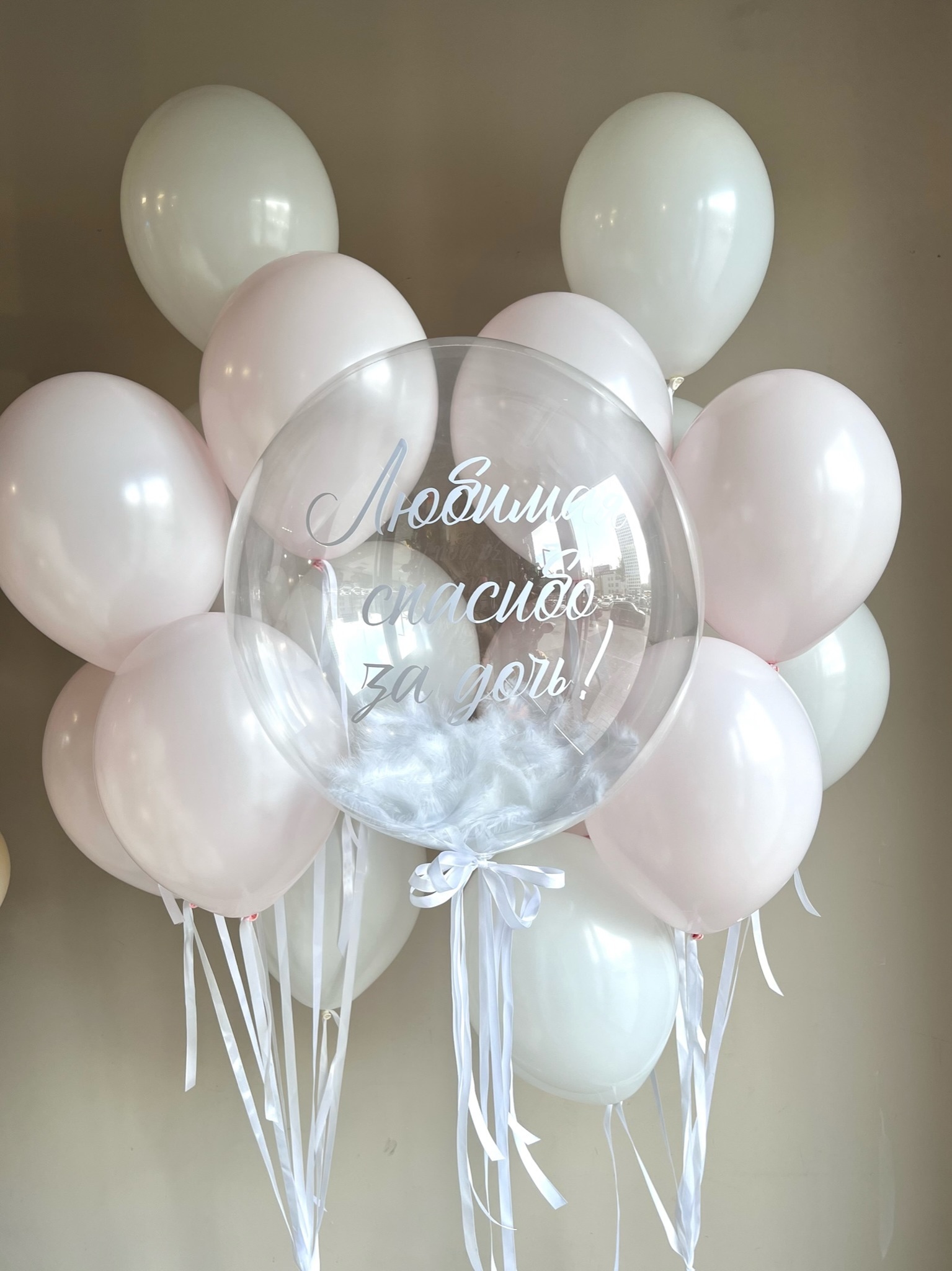 • Два фонтана по 8 шаров на атласных лентах (4 белых, 4 розовый макарунс)