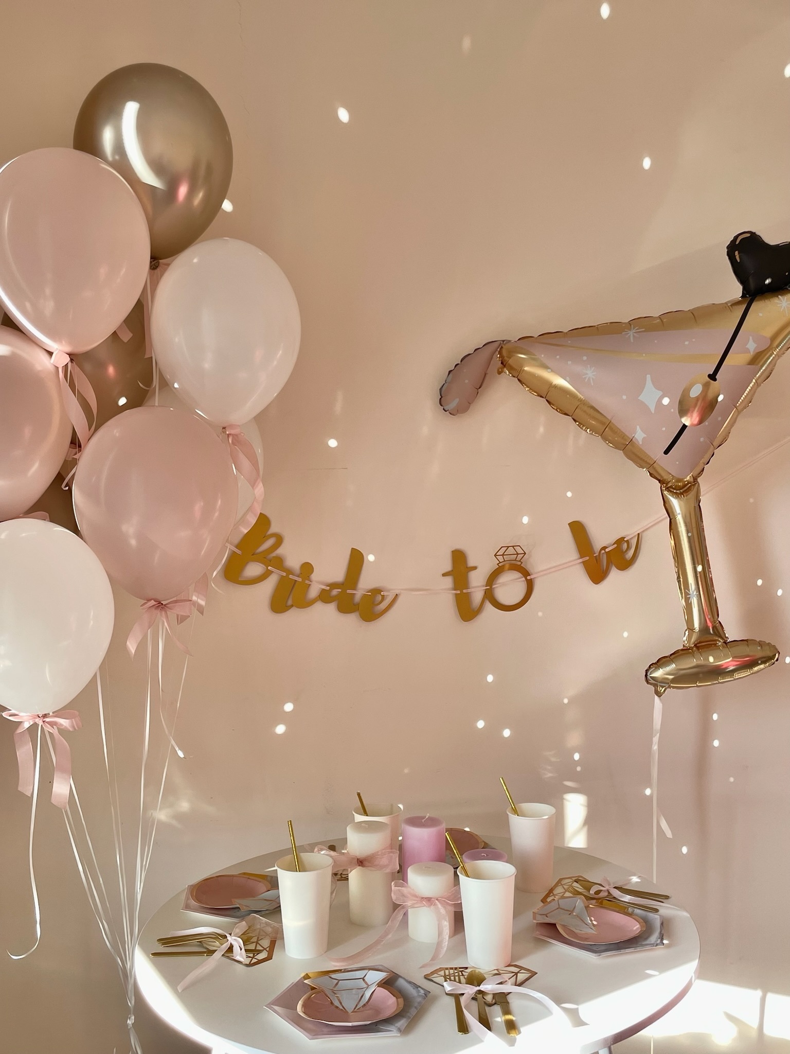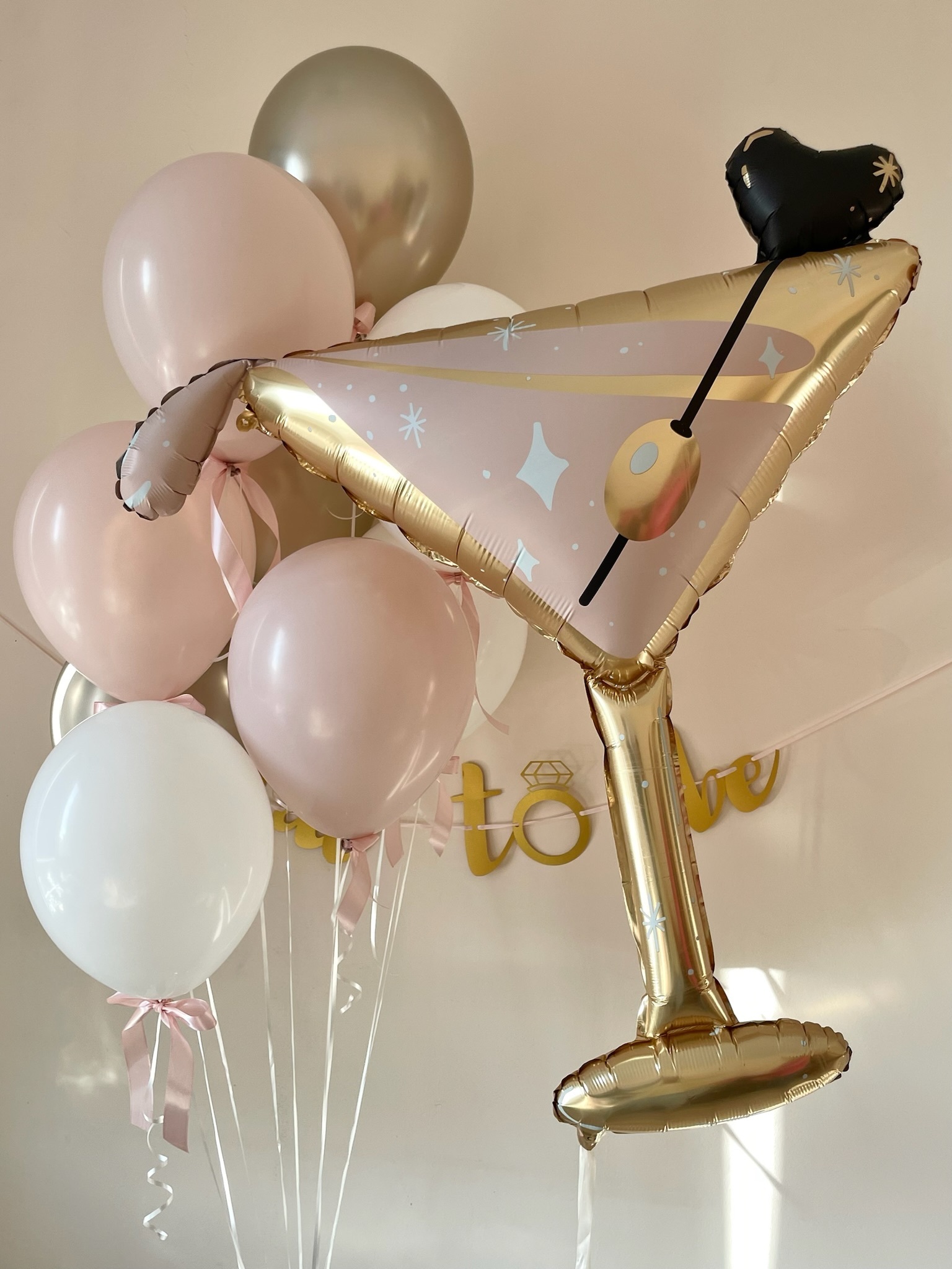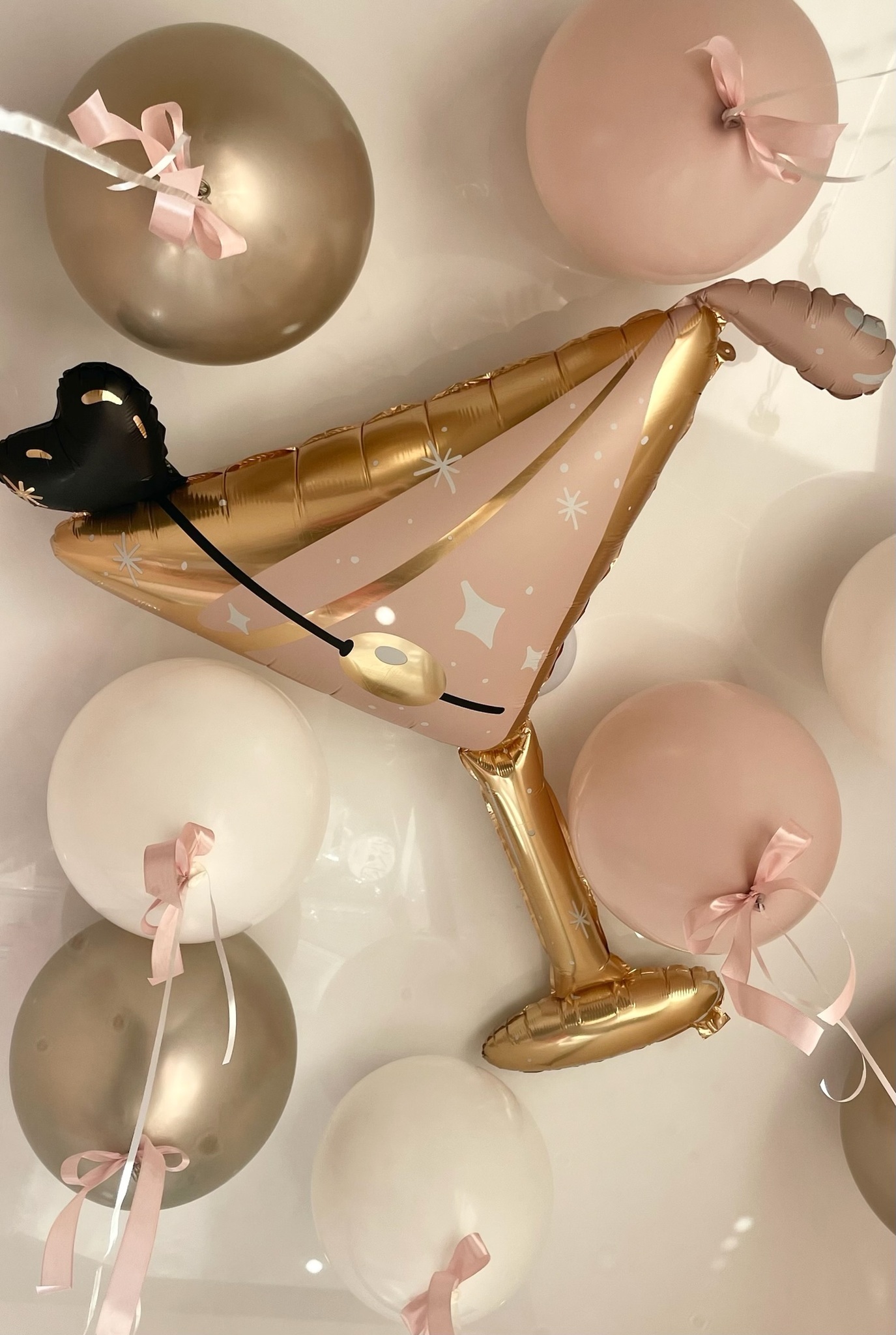 • Фонтан из 10 шаров с бантиками снизу шара (3 хром Шампань, 4 белых, 3 пыльная Роза)
