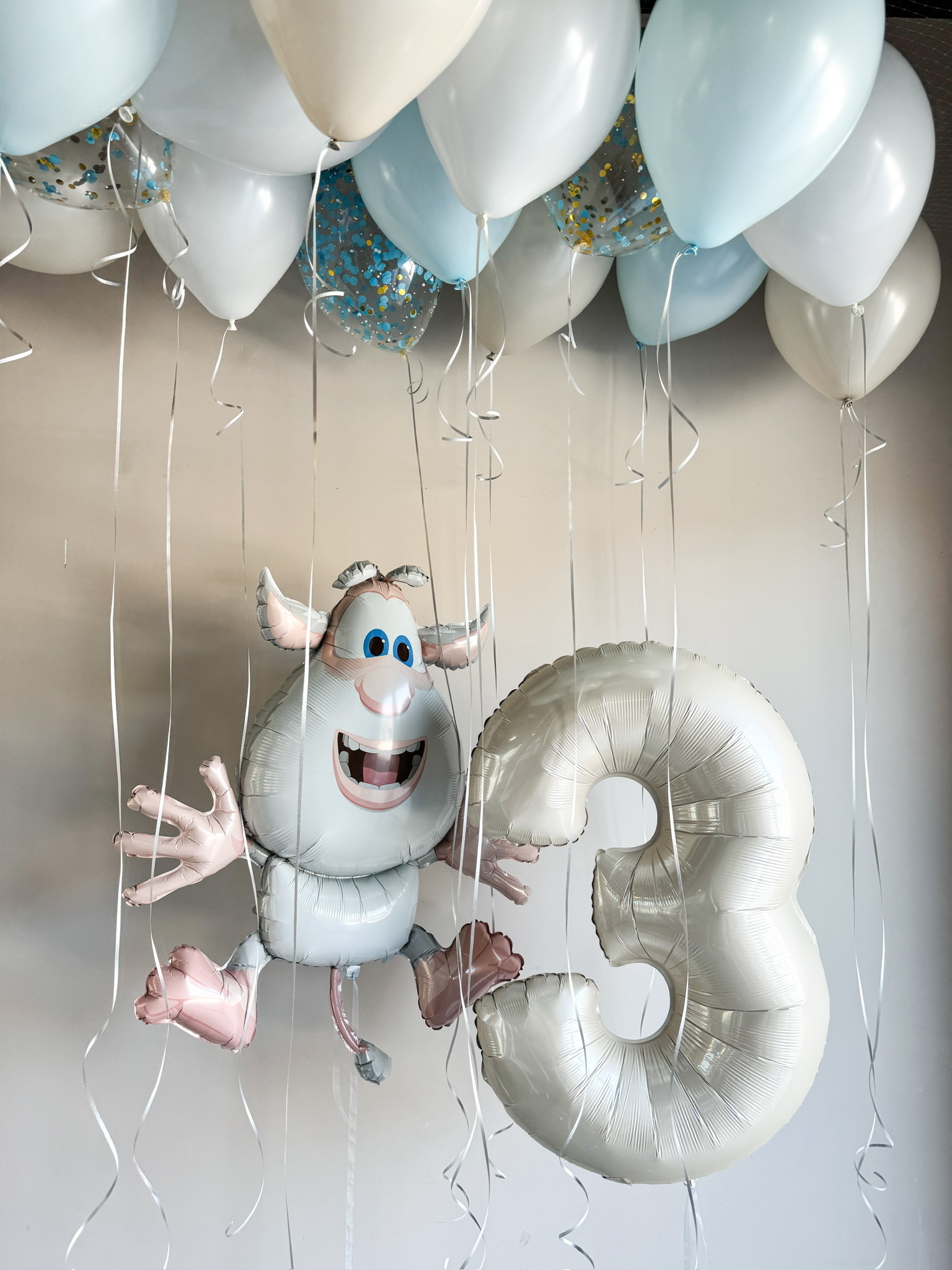 под потолок 15 шаров (12 обычных и 3 с конфетти)