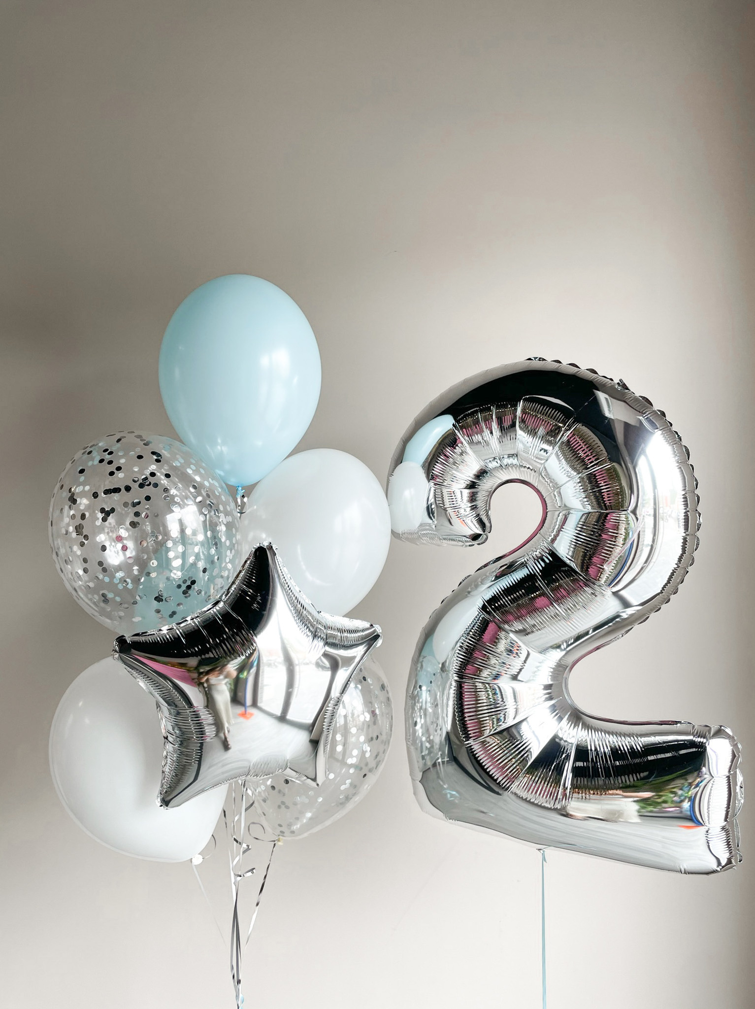- Фонтан из 7 шаров: звезда, 2 с конфетти и 4 однотонных.