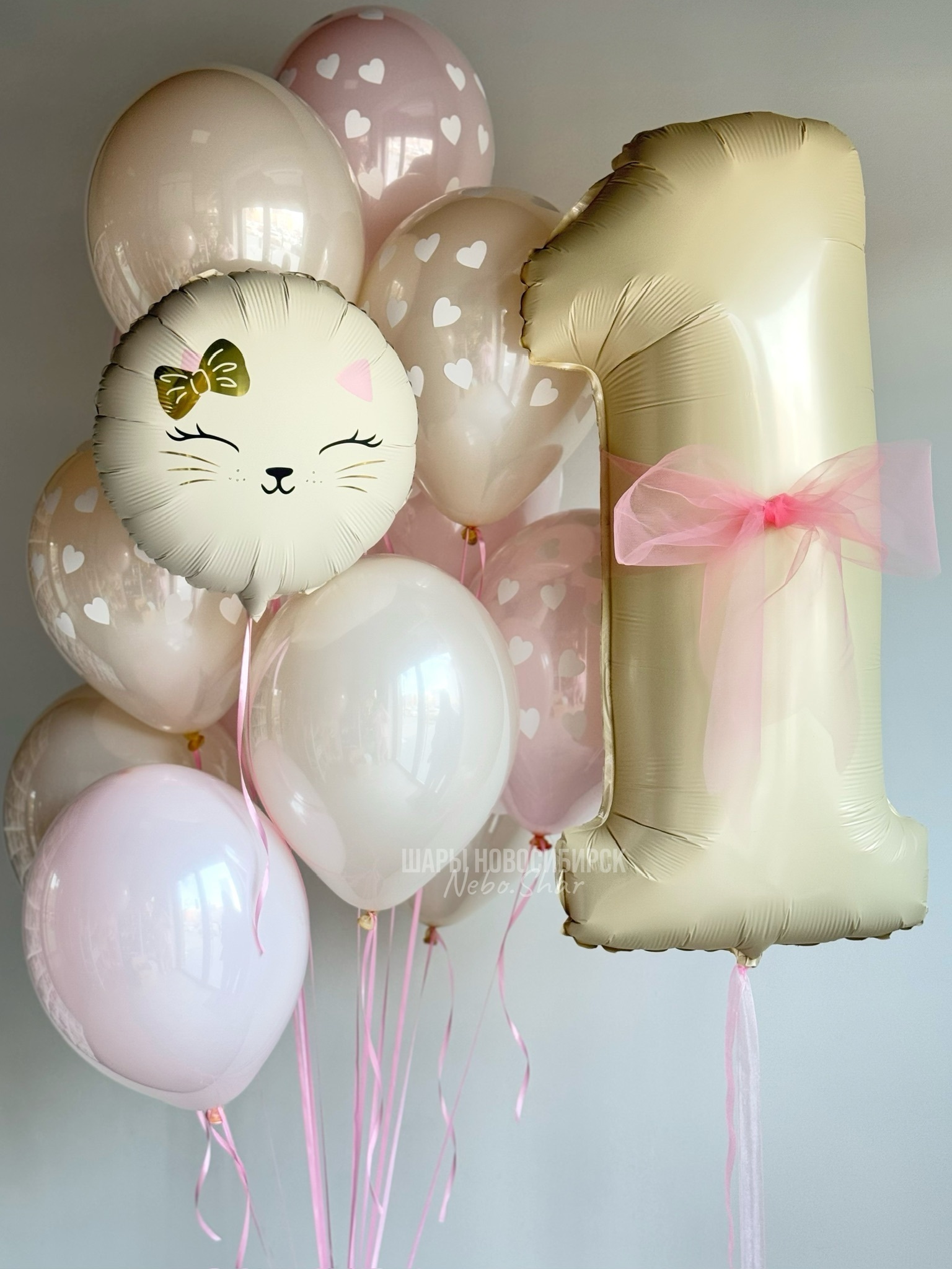 • Фонтан из 13 шаров (круг «Киска с бантиком» и 12 шаров дабл Стафф в гамме розовый макарунс и белый песок)