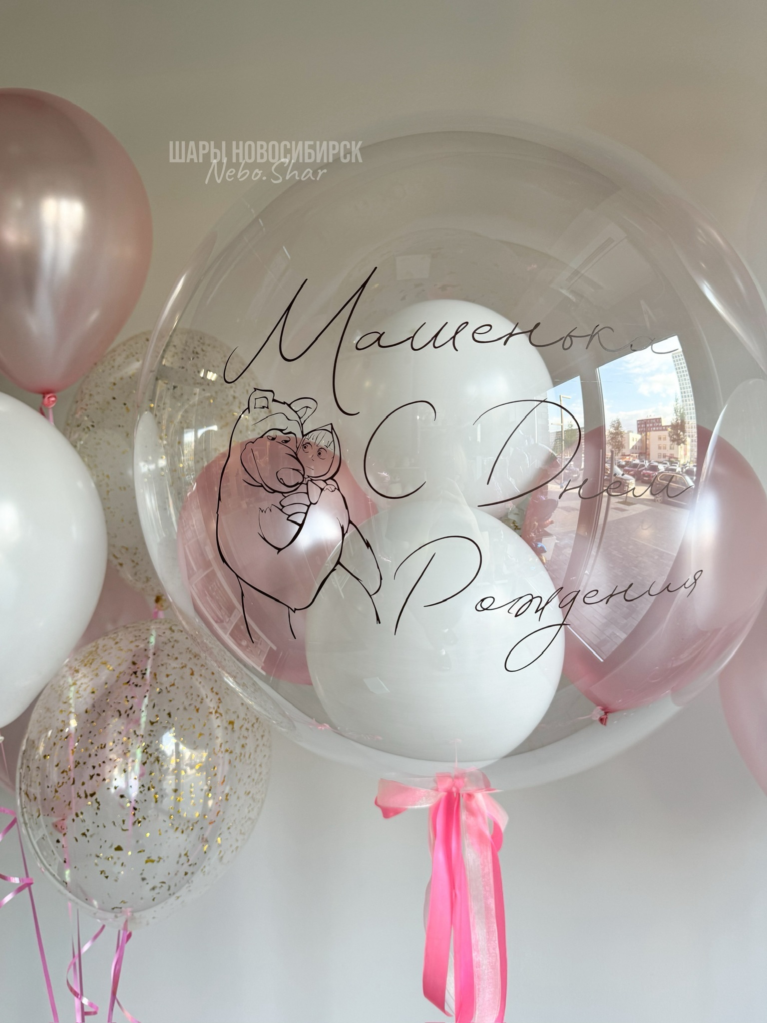 • Два фонтана по 5 Шаров (2 розовый перламутр, 2 прозрачных с конфетти, 1 белый)