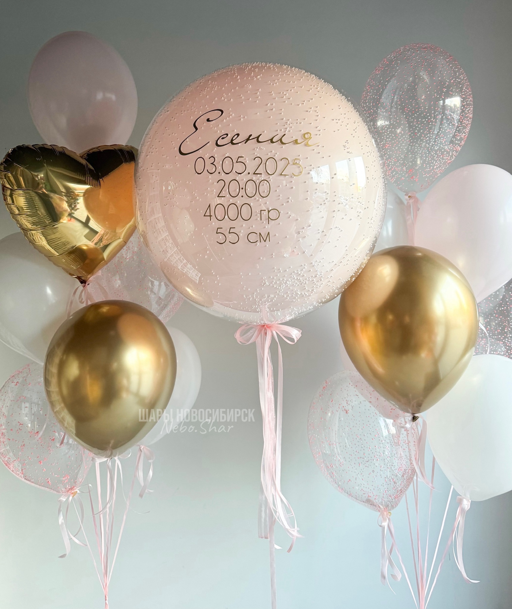 • Фонтан 8 шаров (1 сердце 45 см золото, 1 хром золото, 2 прозрачных с конфетти, 2 розовый макарунс, 2 белых)