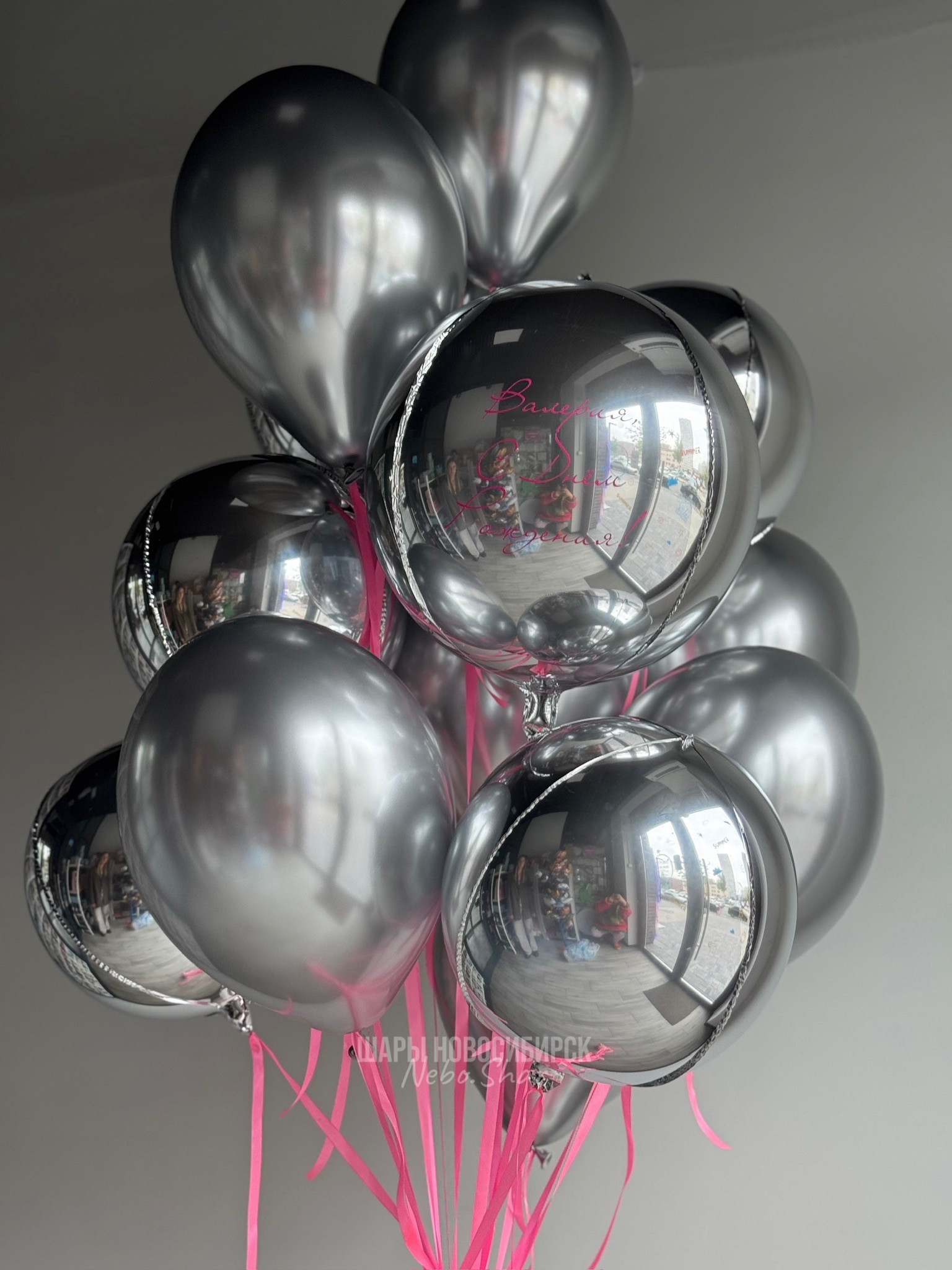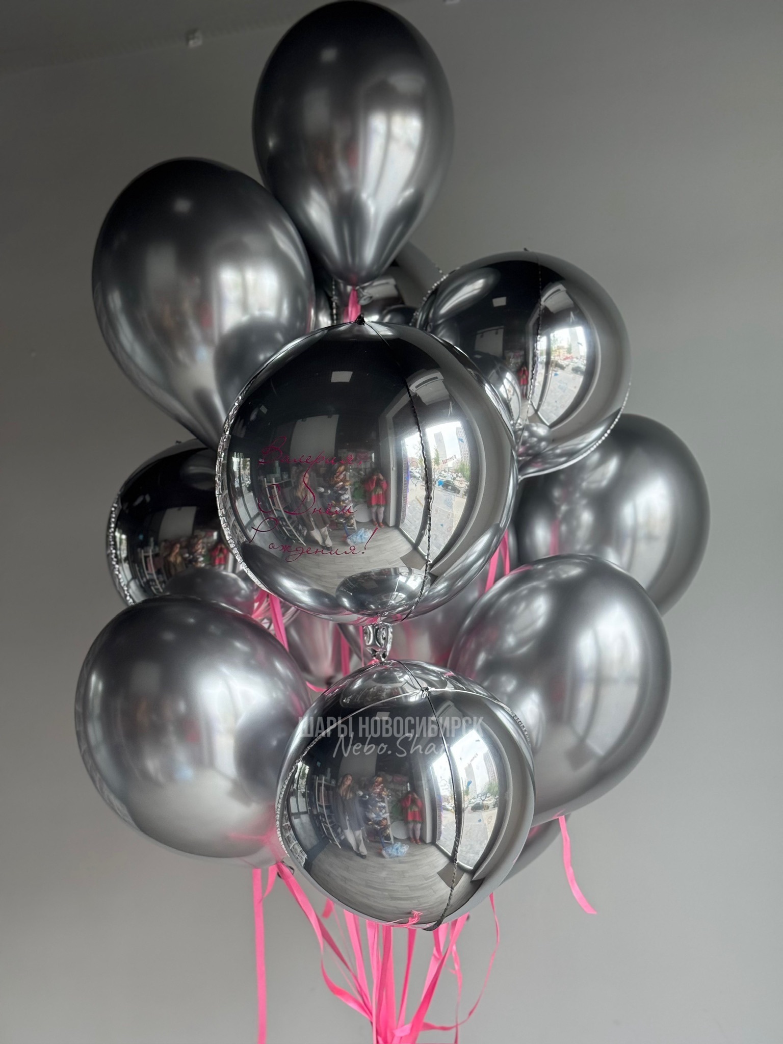• Фонтан из 15 шаров (2 сферы 51 см, 4 сферы 38 см, 9 хром серебро)