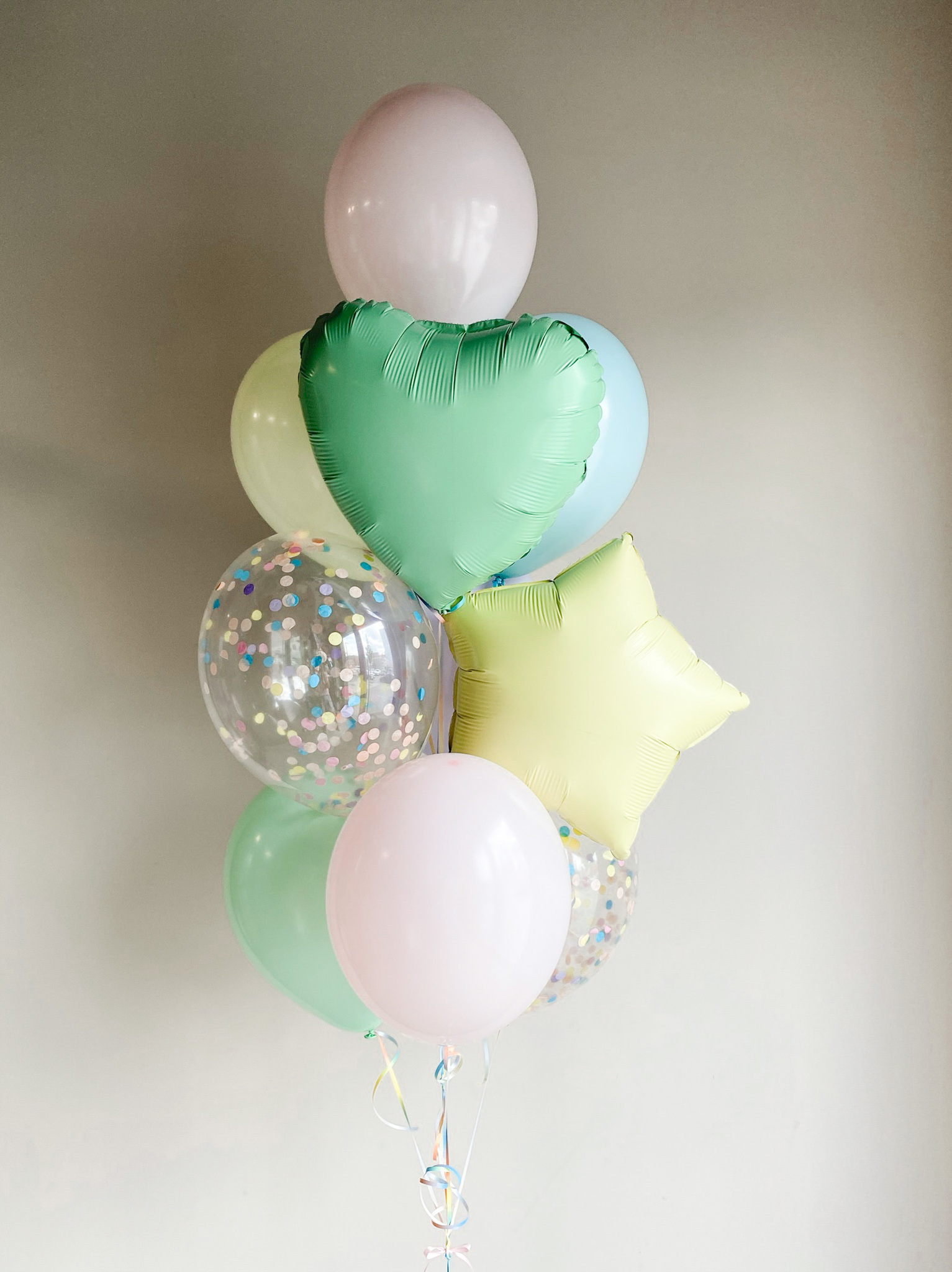 - Фонтан из 10 шаров: звезда, сердце, 2 с конфетти и 6 однотонных