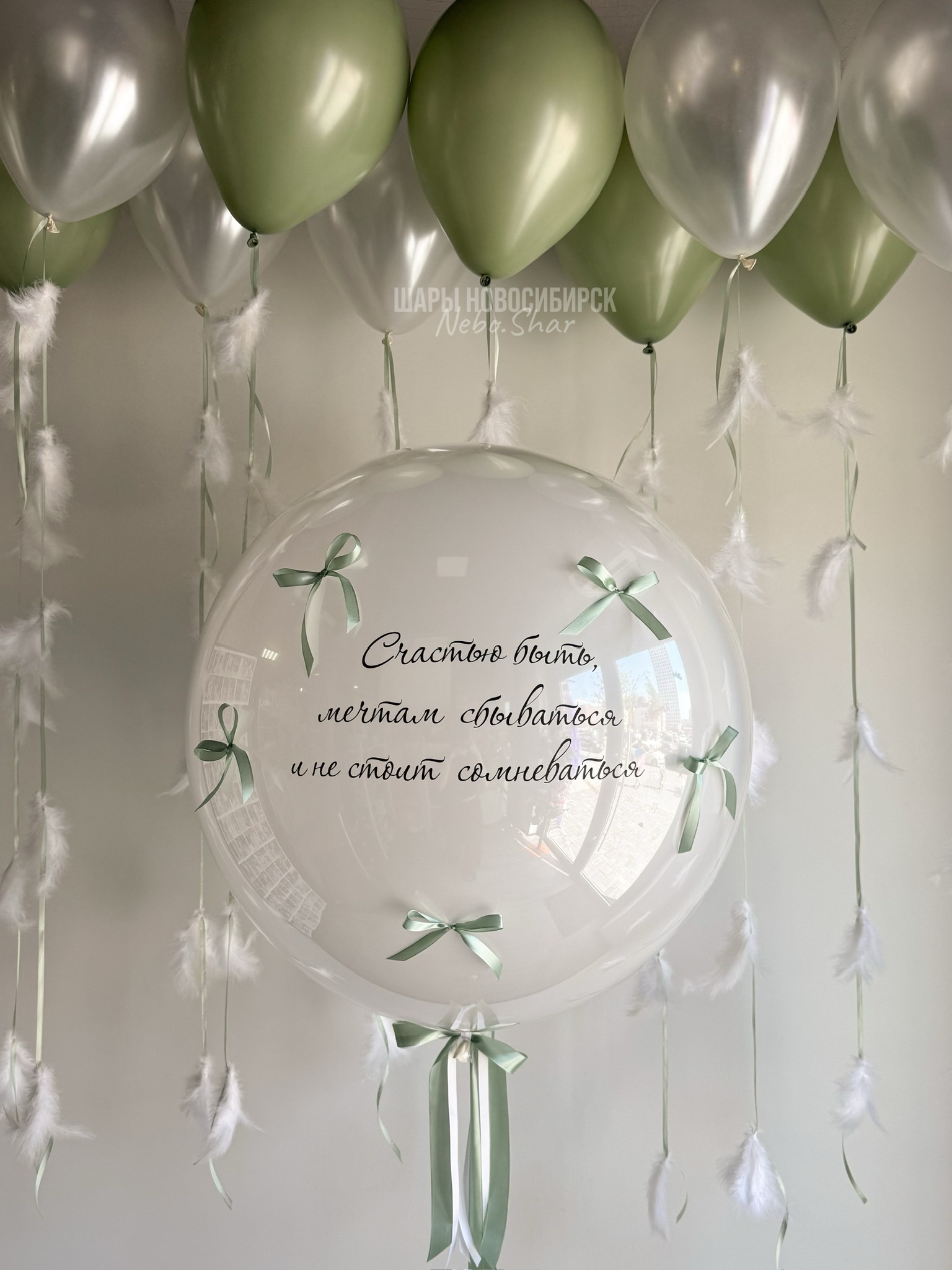 • 10 латексных Шаров под потолок с перьями по ленте (5 эвкалипт, 5 жемчужный перламутр)