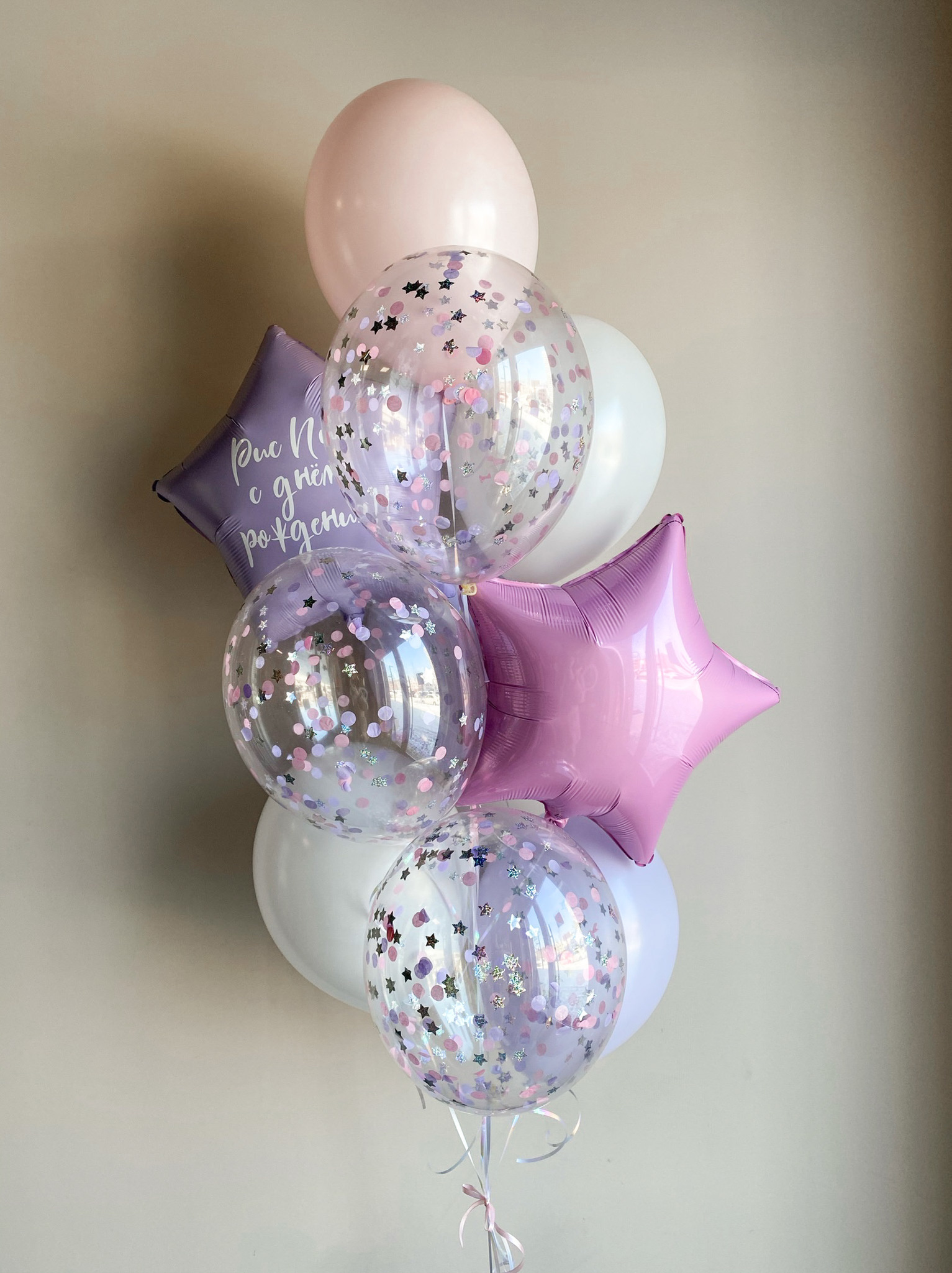 - Фонтан из 10 шаров: звезда с надписью, звезда, 3 с конфетти и 5 однотонных