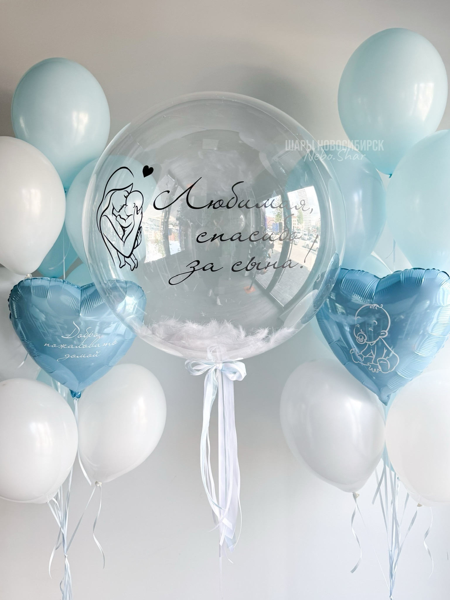 • Два фонтана по 10 Шаров (сердце голубое 45 см, 5 голубой макарунс, 4 белых)
