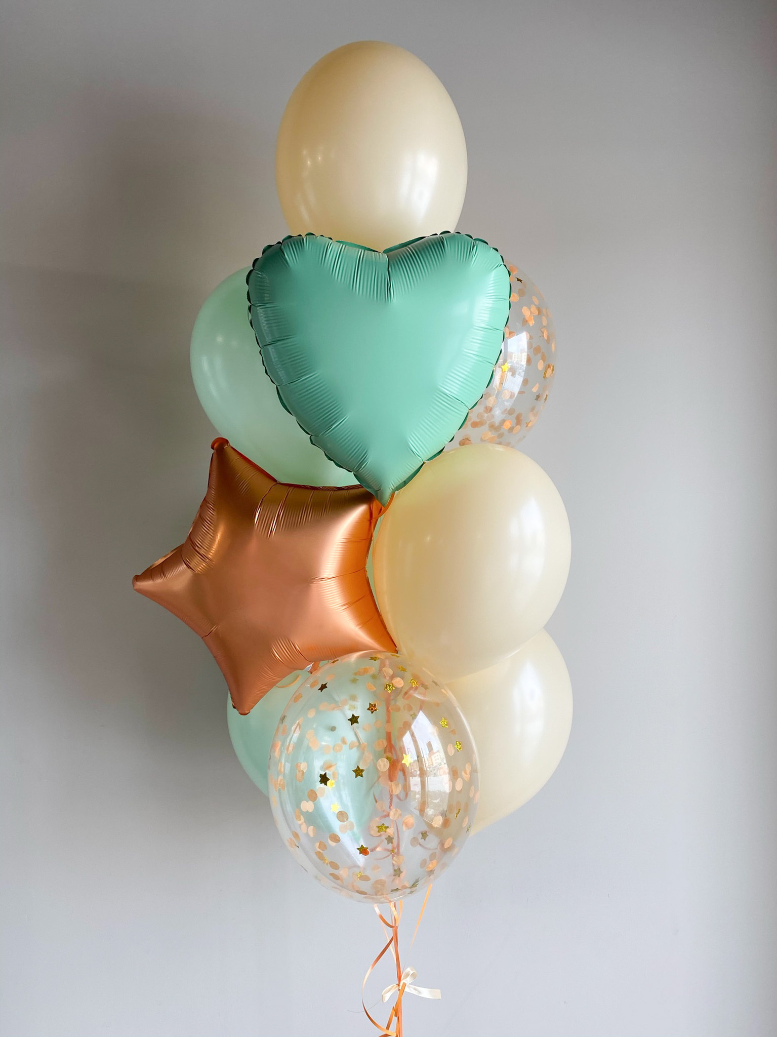 - Фонтан из 10 шаров: звезда, сердце, 2 с конфетти и 6 однотонных.