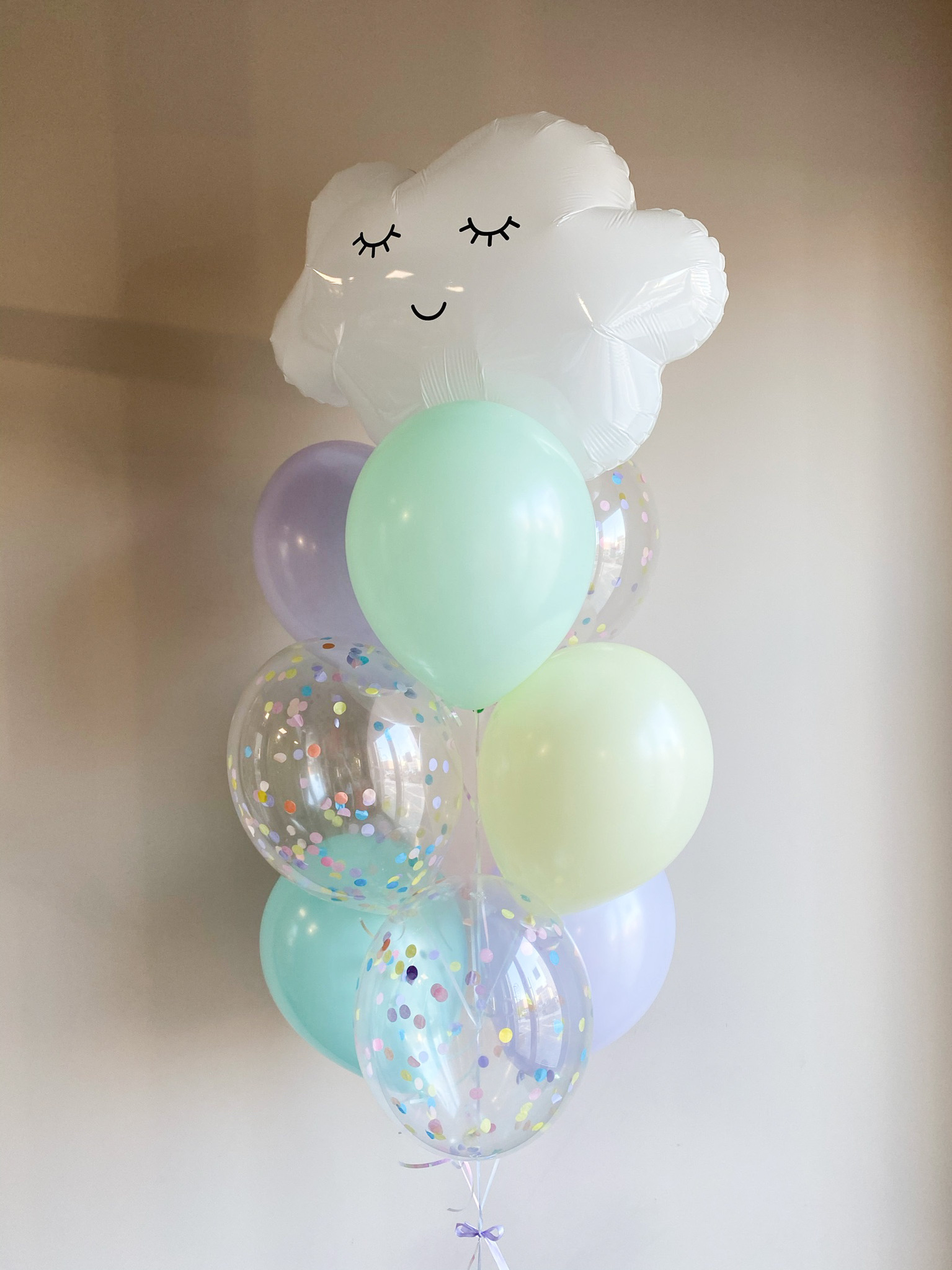 - Фонтан из 10 шаров: фигурка Облако, 3 с конфетти, 6 однотонных.