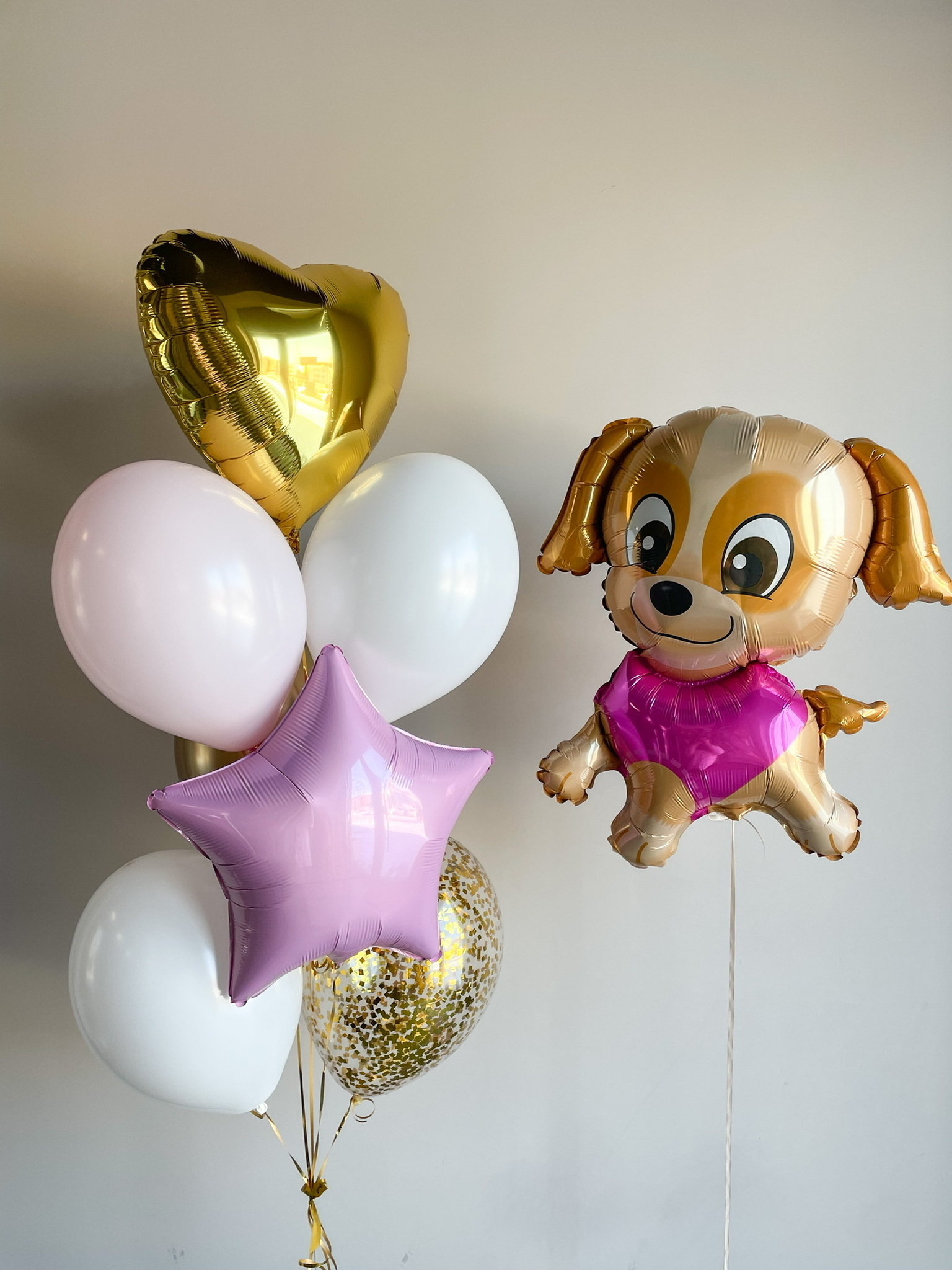 - Фонтан из 7 шаров: звезда, сердце, 1 с конфетти, 1 хром и 3 однотонных