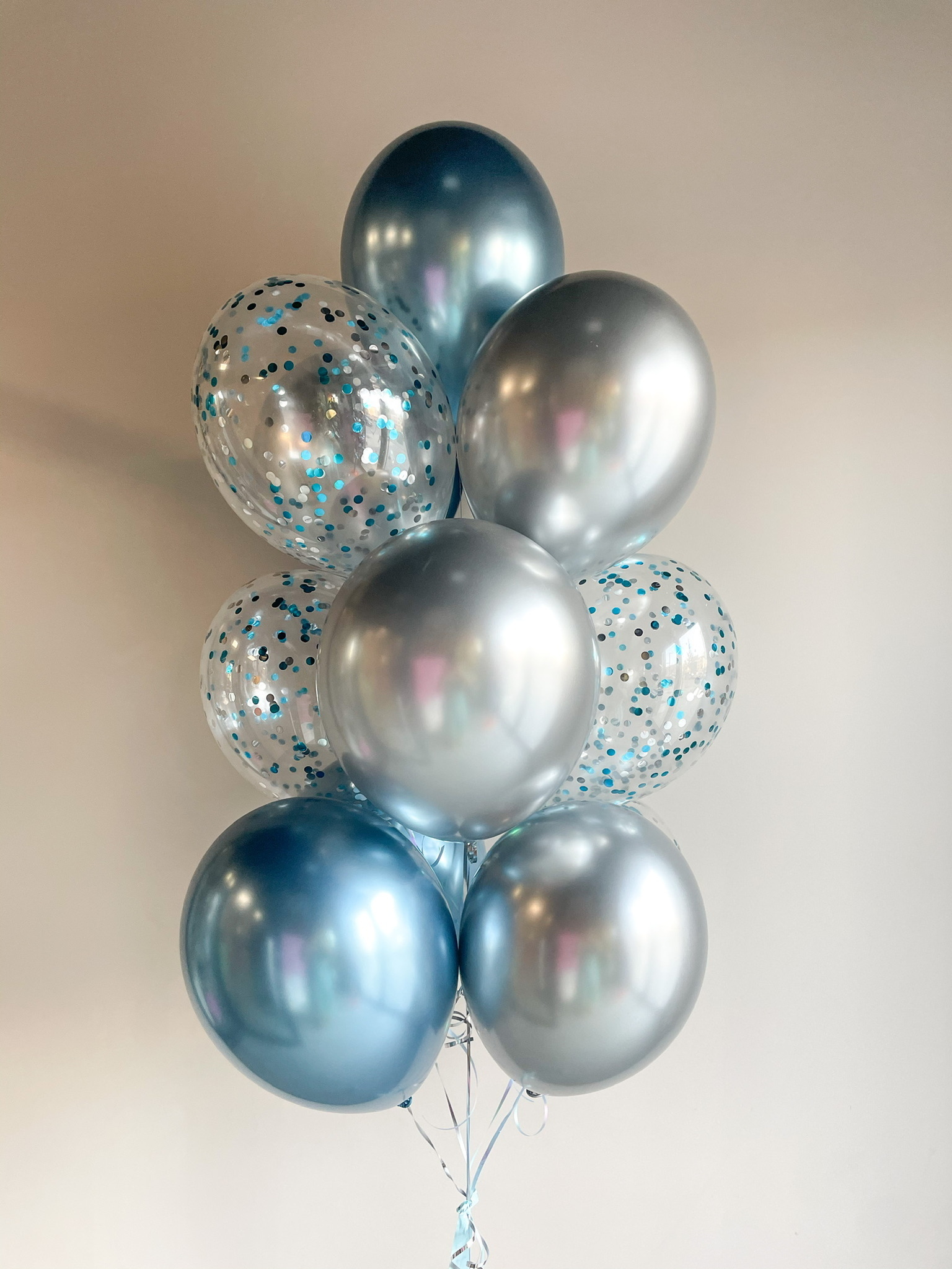 • Фонтан из 13 шаров (5 прозрачных с конфетти, 4 хром серебро, 4 хром Shiny Blue)