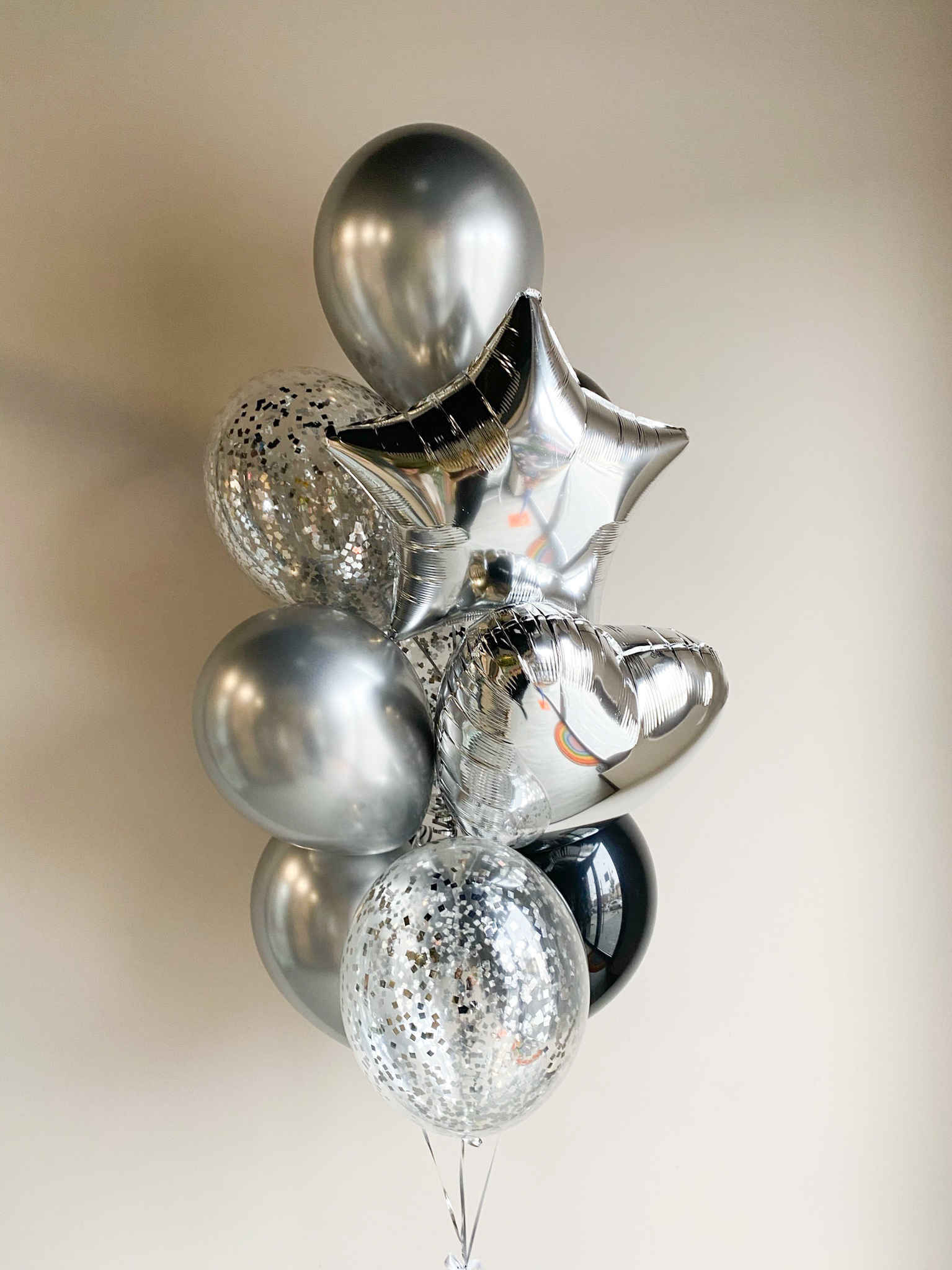 - Фонтан из 10 шаров: звезда, сердце, 3 с конфетти, 3 хром и 2 однотонных