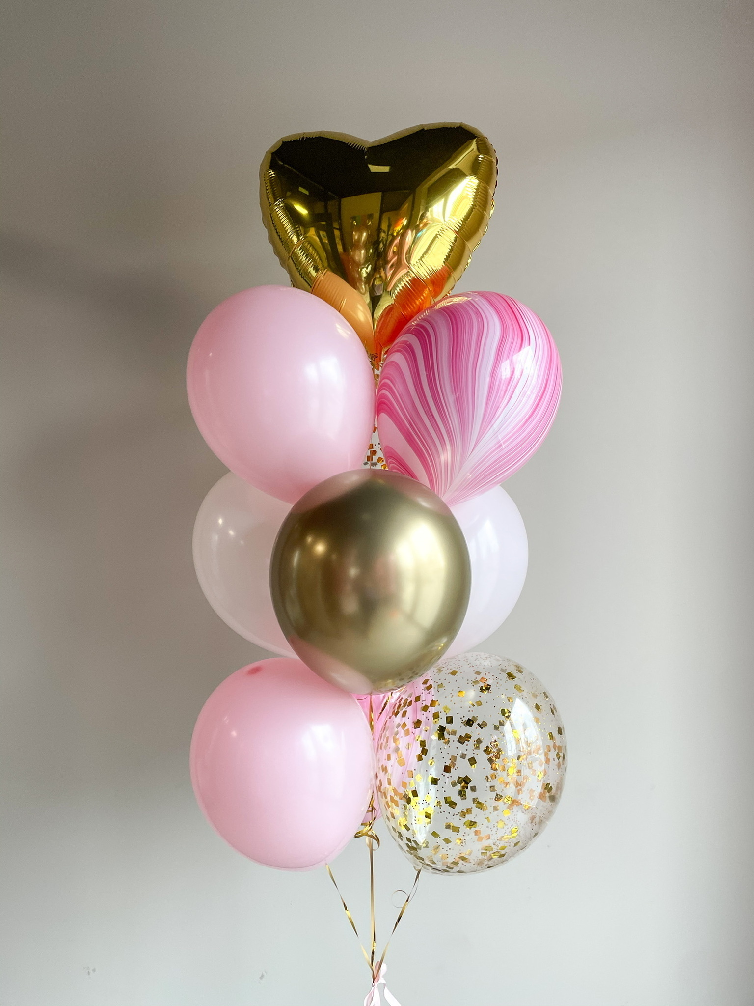 - Фонтан из 10 шаров: сердце, 2 с конфетти, 1 агат, 1 хром и 5 однотонных
