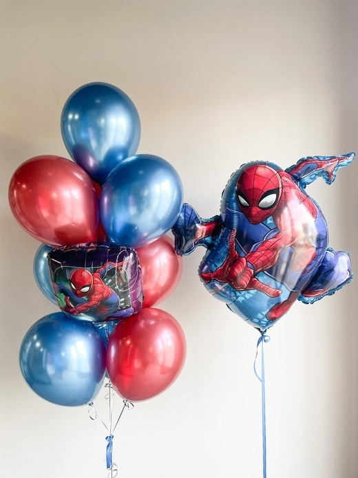 • Фонтан из 10 шаров (5 хром лазурный, 4 хром красный, квадрат «Человек-паук»)
