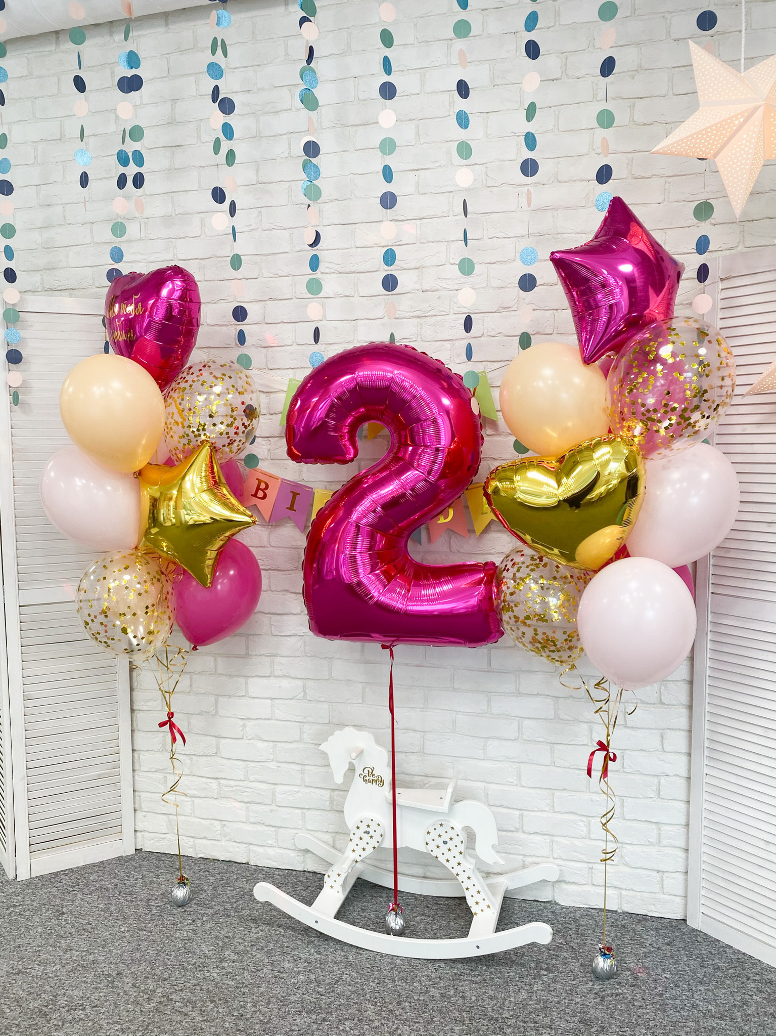 - Два Фонтана из 10 шаров: сердце, звезда, 2 с конфетти и 6 однотонных