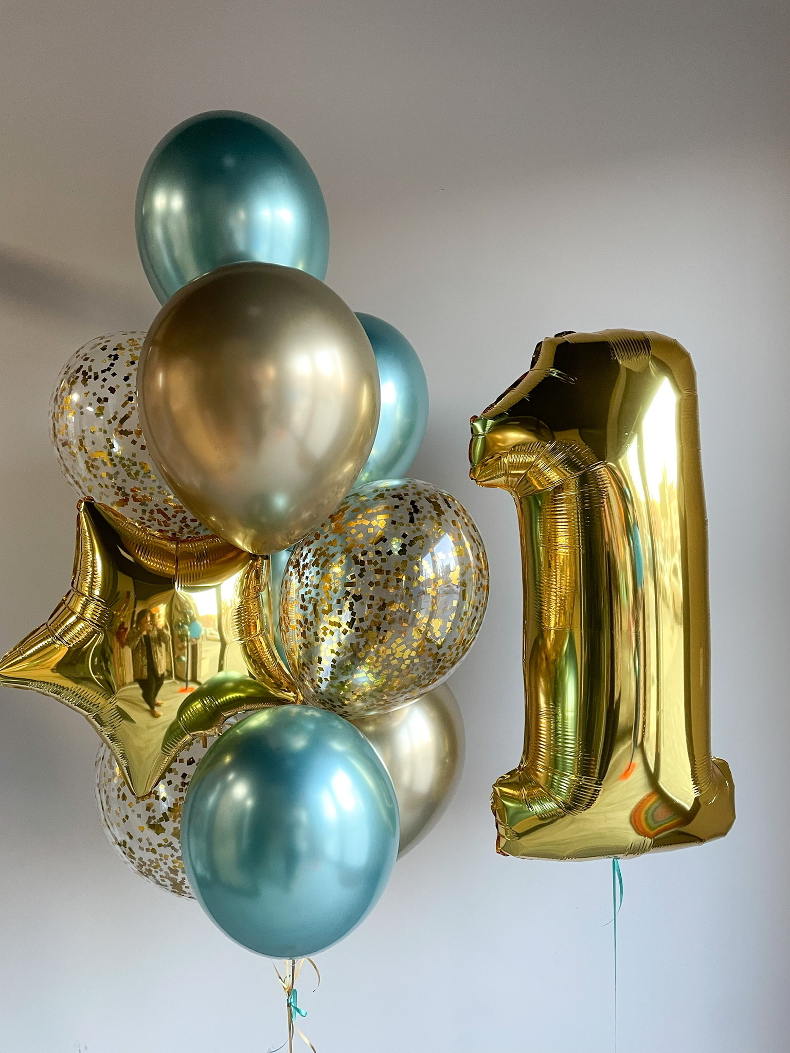 - Фонтан из 10 шаров: звезда, 3 с конфетти и 6 хром