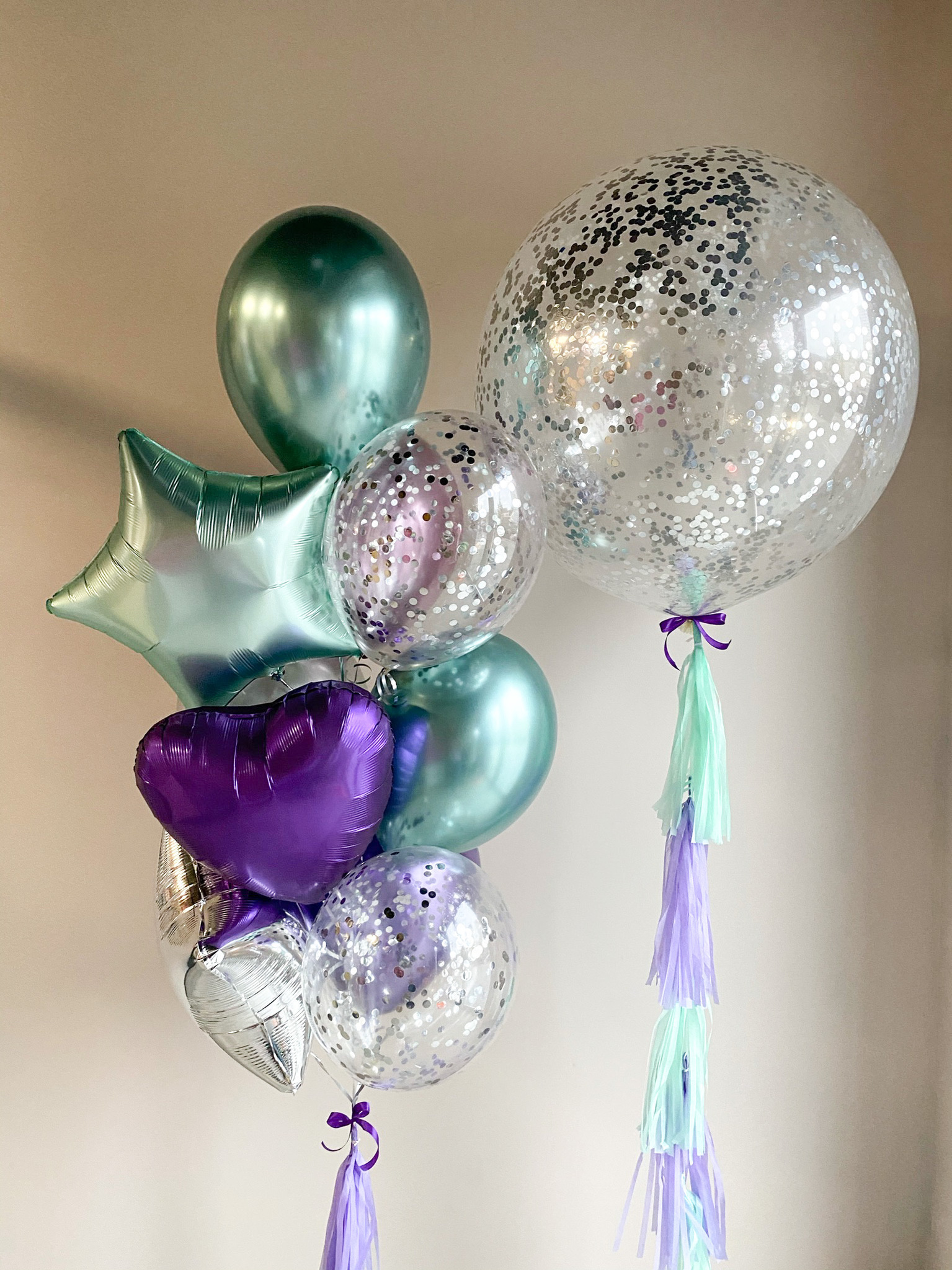 - Фонтан из 10 шаров: 3 фольгированных шара, 2 с конфетти, и 5 шаров хром.