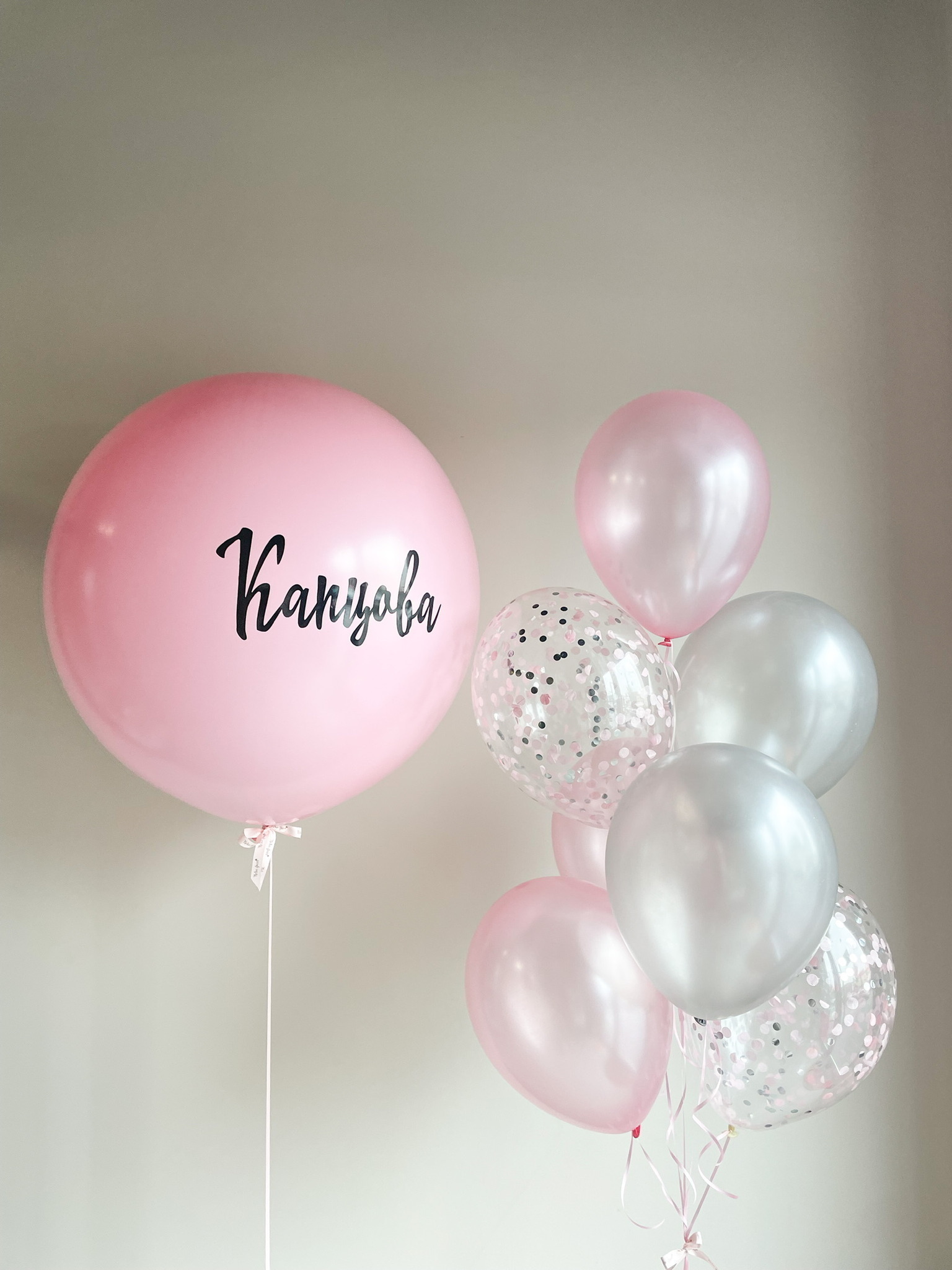 • Фонтан из 7 шаров (3 розовый перламутр, 2 серебро перламутр, 2 прозрачных с конфетти)
