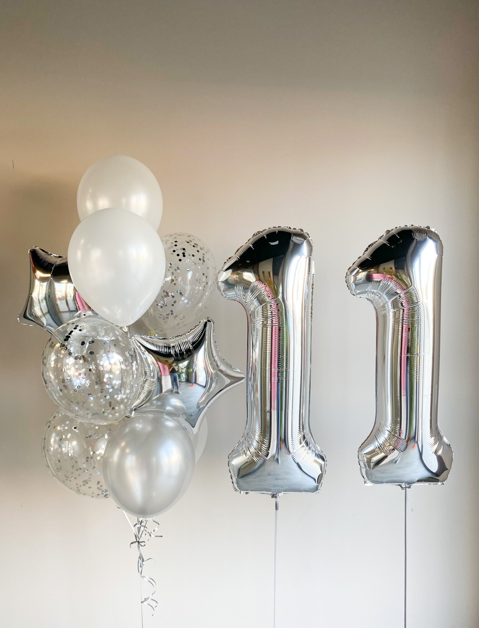 - Фонтан из 10 шаров: 2 звезды, 3 с конфетти и 5 однотонных