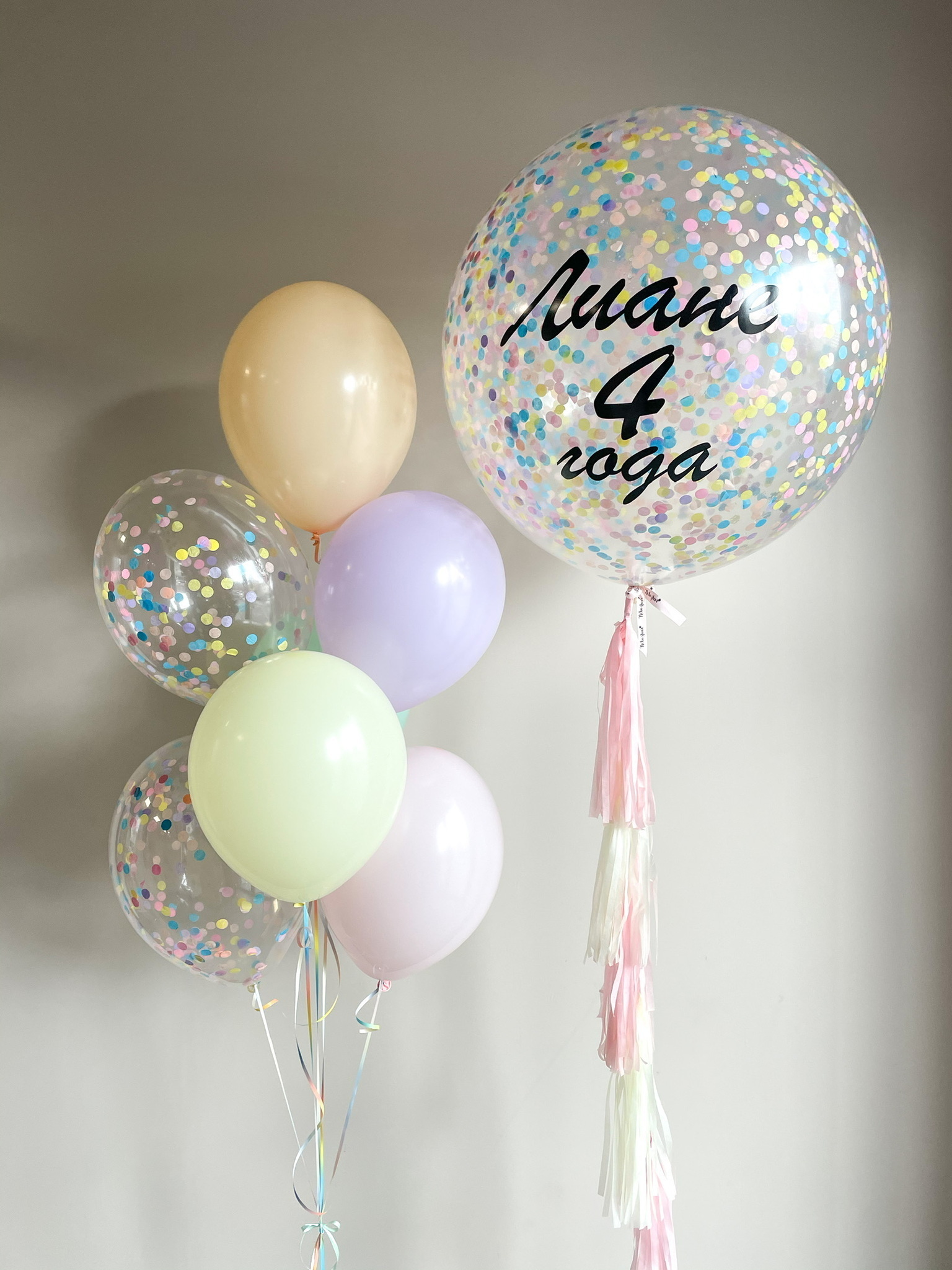 - Шар гигант с конфетти с индивидуальной надписью + кисточки тассел до пола
