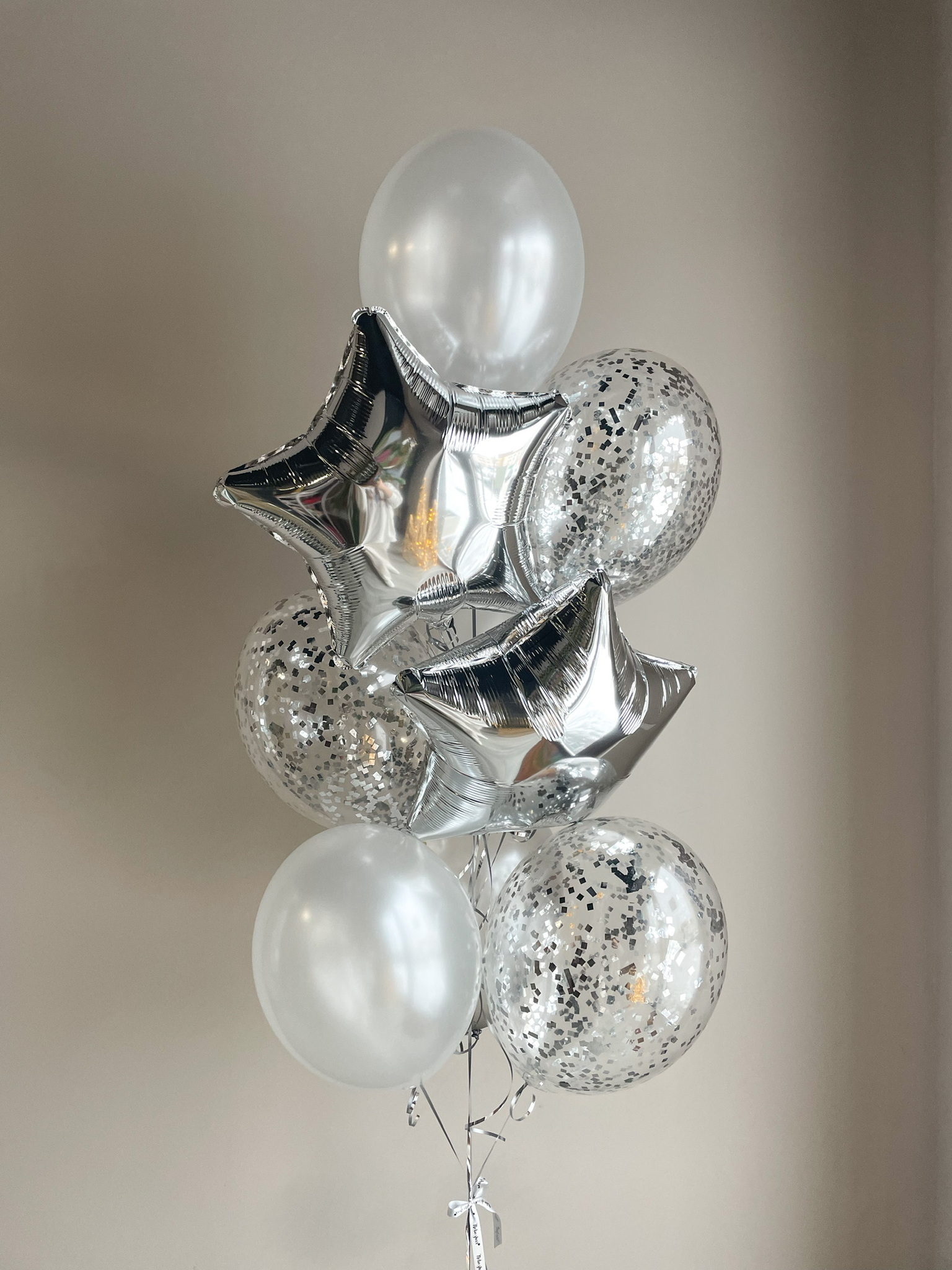 • Фонтан из 10 шаров (2 звезды серебро, 3 прозрачных с конфетти, 3 жемчужный перламутр, 2 серебро перламутр)