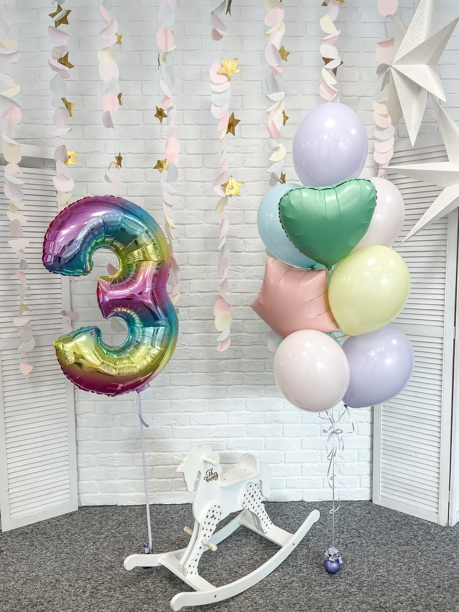 - Фонтан из 10 шаров: звезда, сердце и 8 однотонных.