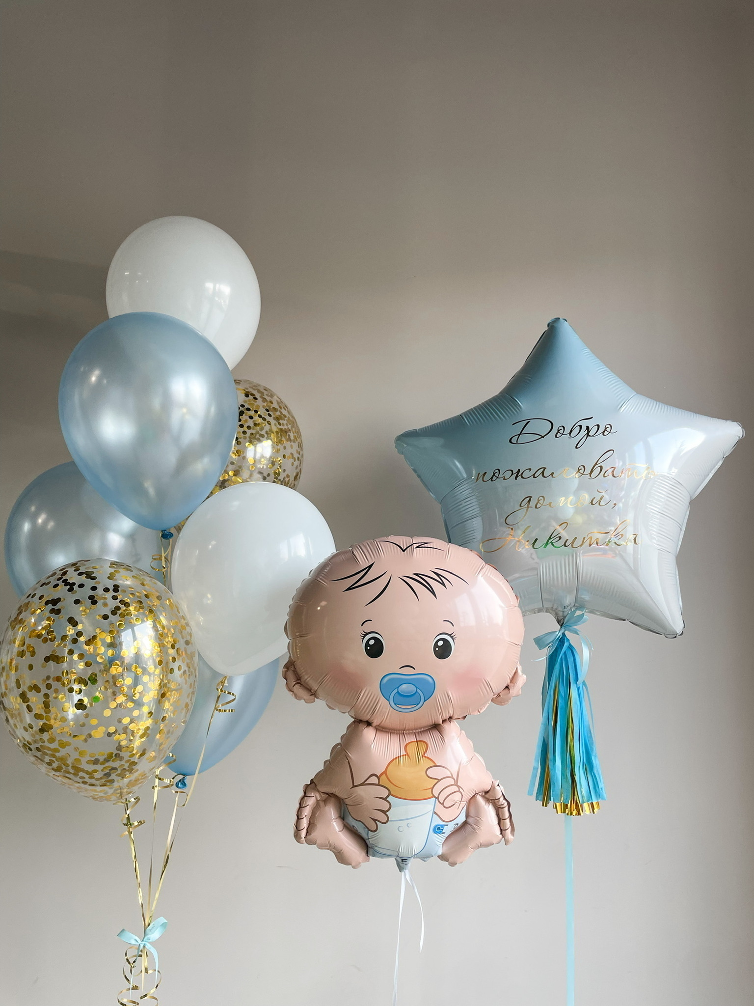 • Фонтан из 7 шаров (3 голубой перламутр, 2 белых, 2 прозрачных с конфетти)