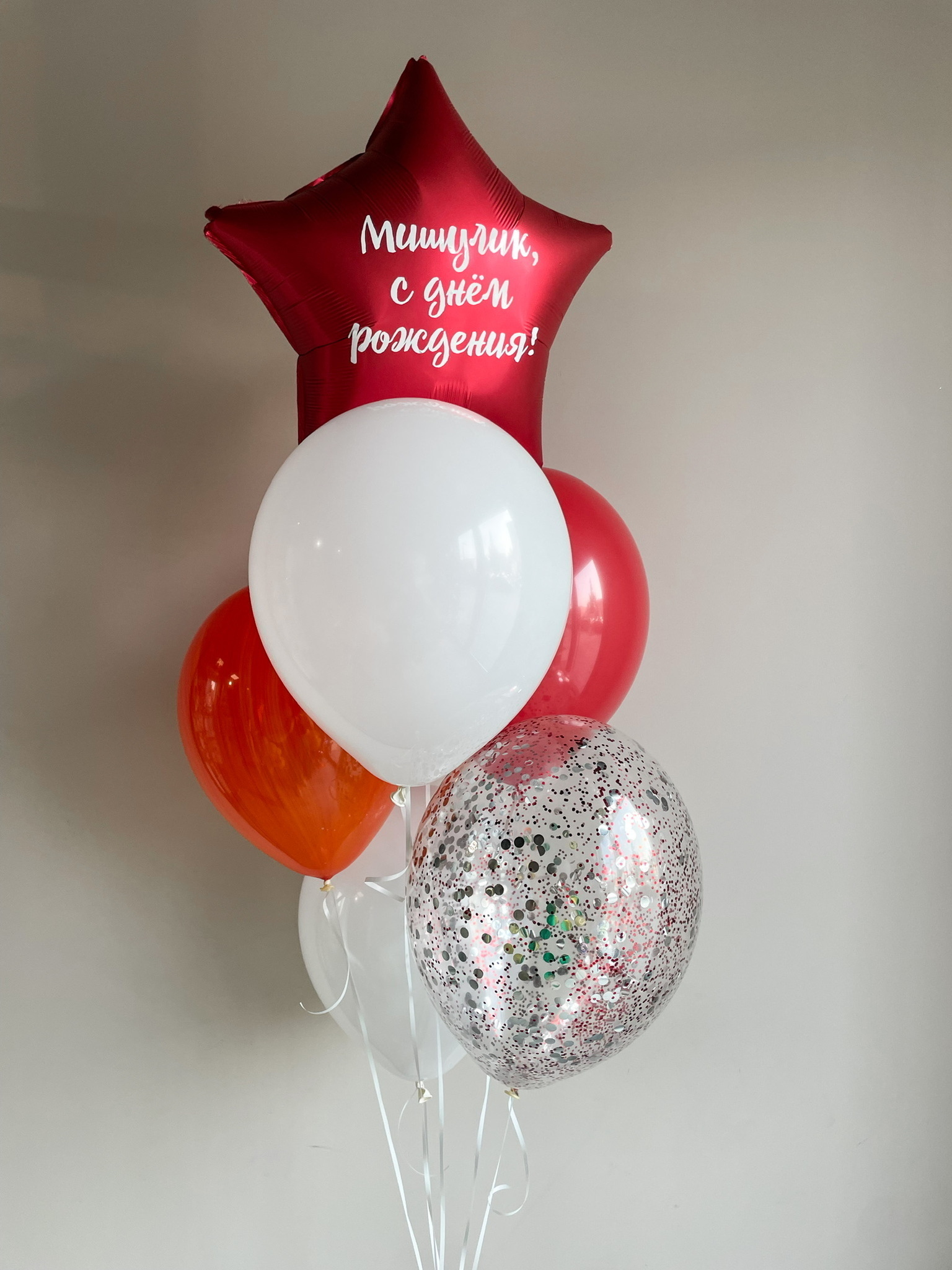 - Фонтан из 6 шаров: звезда с надписью, 1 с конфетти и 4 однотонных