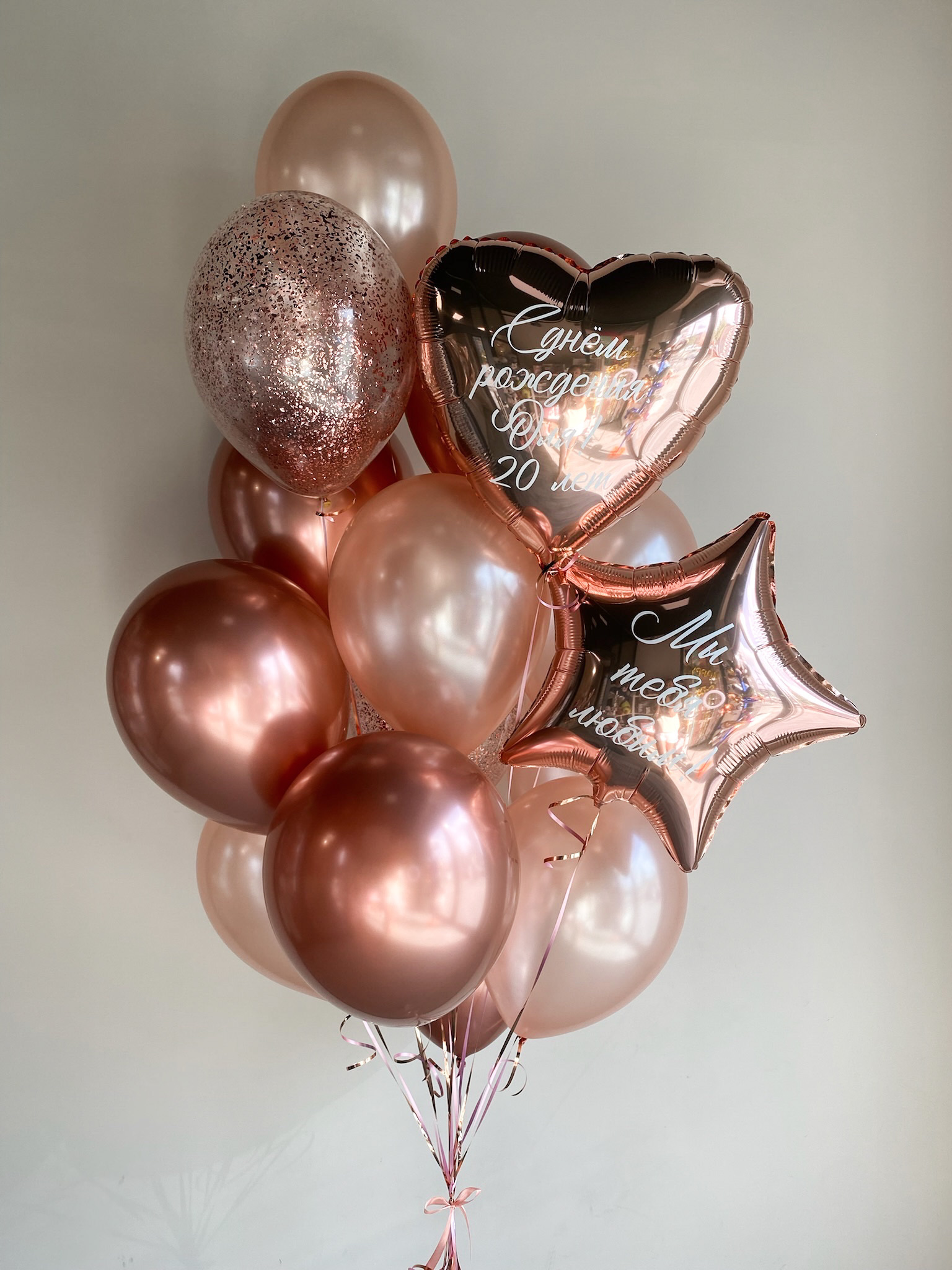 - Фонтан из 15 шаров: звезда и сердце с индивидуальной надписью, 4 хром, 2 с конфетти и 7 однотонных