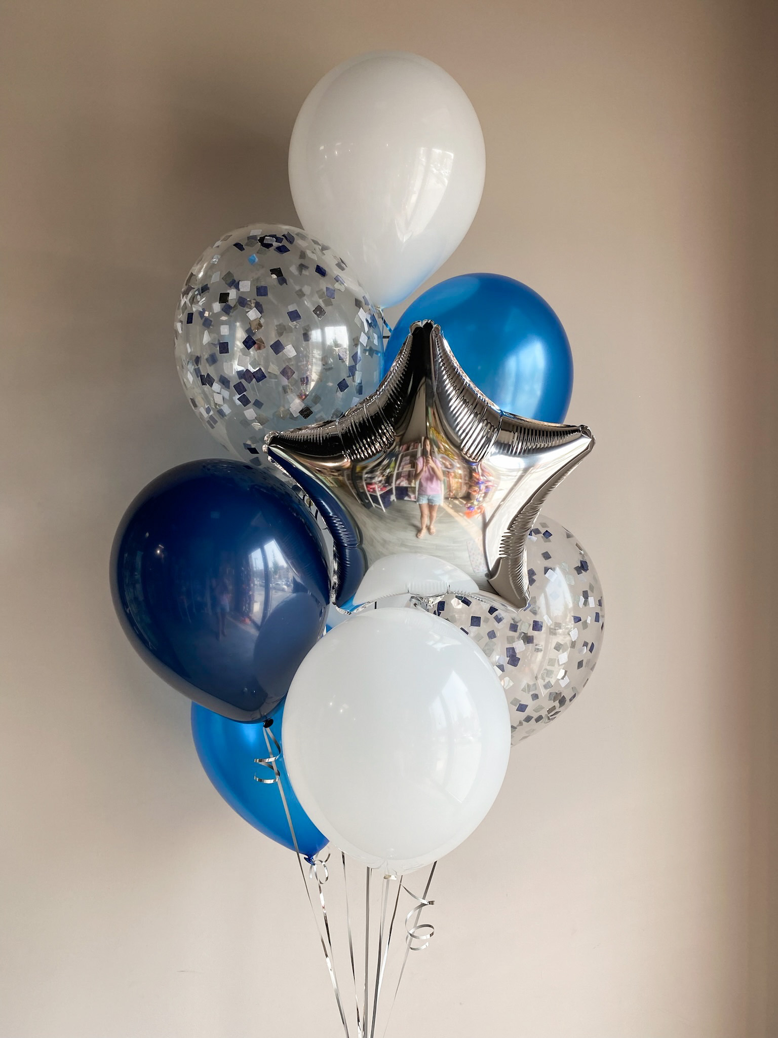 - Фонтан из 9 шаров: звезда, 2 с конфетти и 6 однотонных