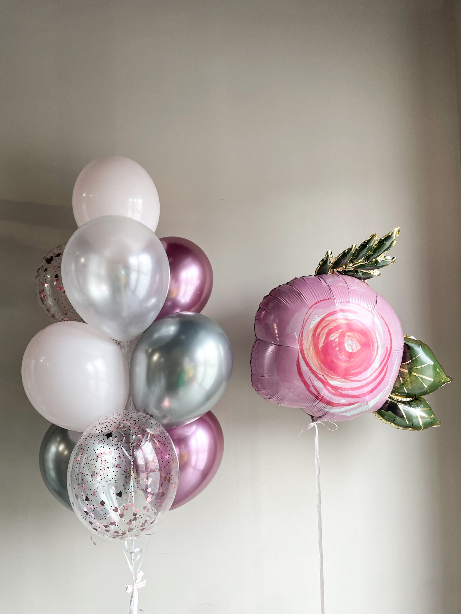 - Фонтан из 10 шаров: 2 с конфетти, 4 хром и 4 однотонных