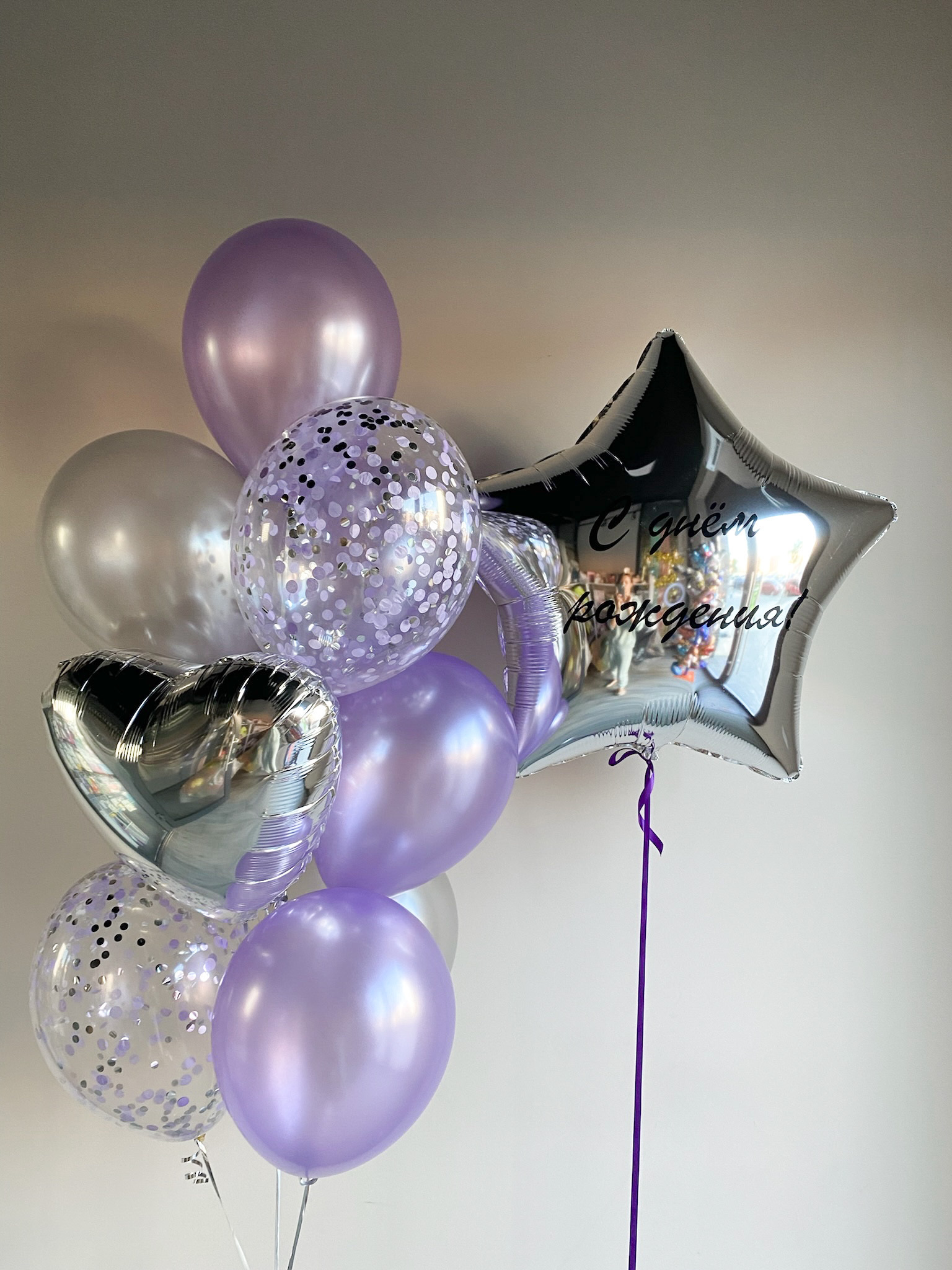 - Фонтан из 10 шаров: сердце, 2 с конфетти и 7 однотонных