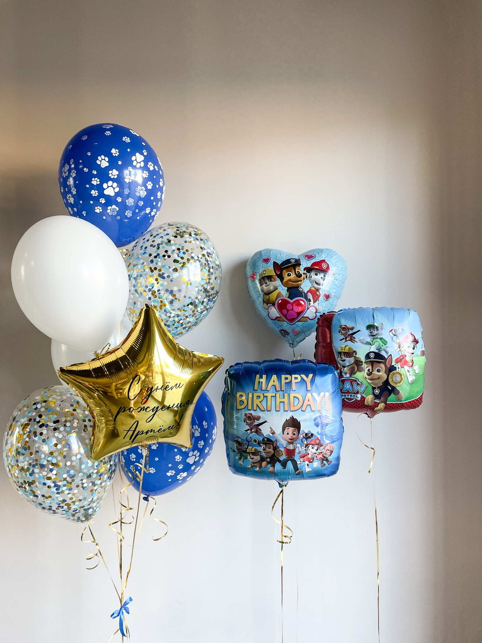 - Фонтан из 7 шаров: звезда с индивидуальной надписью, 2 с конфетти, 2 с рисунком и 2 однотонных.