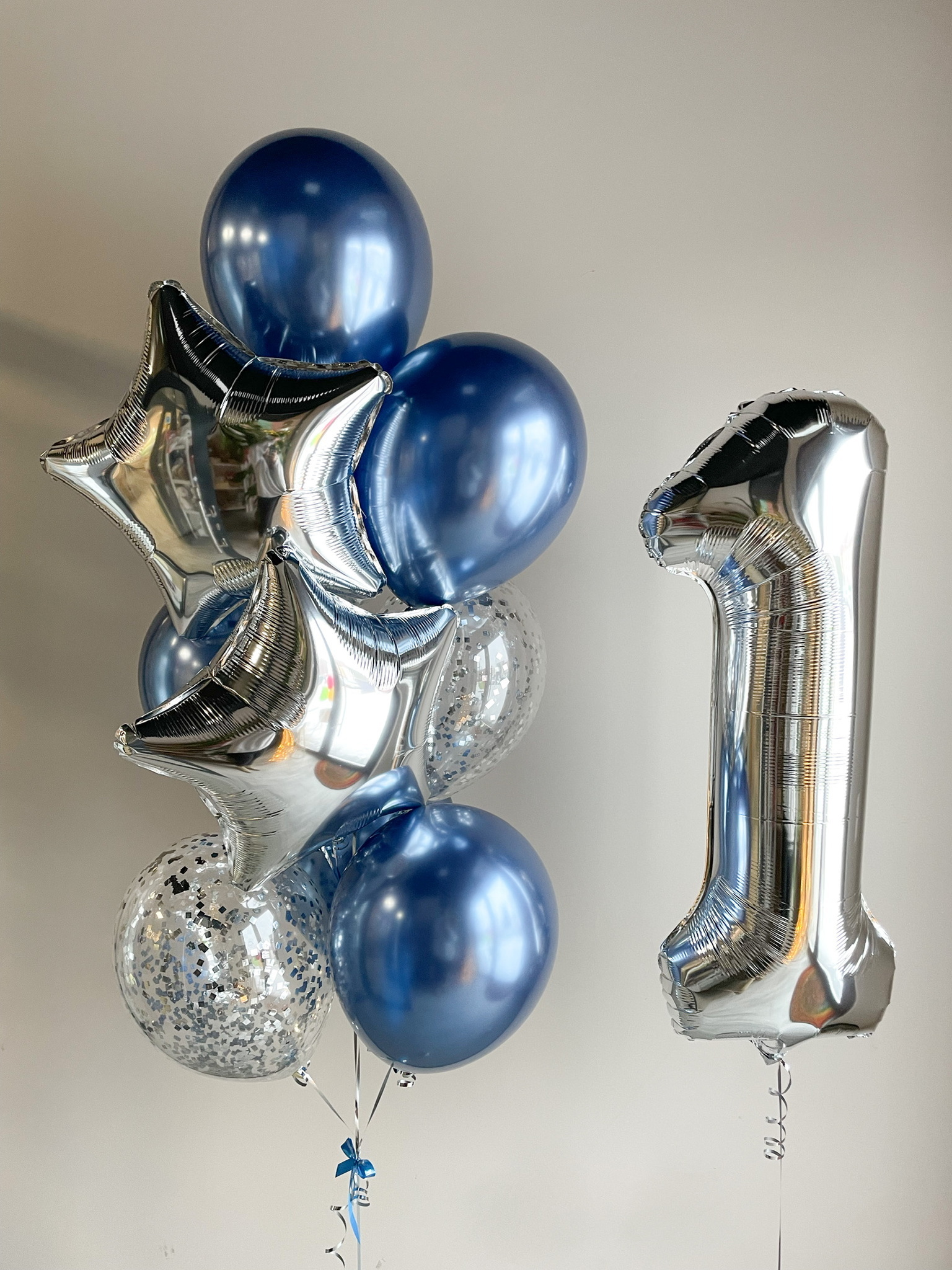 - Фонтан из 10 шаров: 2 звезды 3 с конфетти, 5 хром.