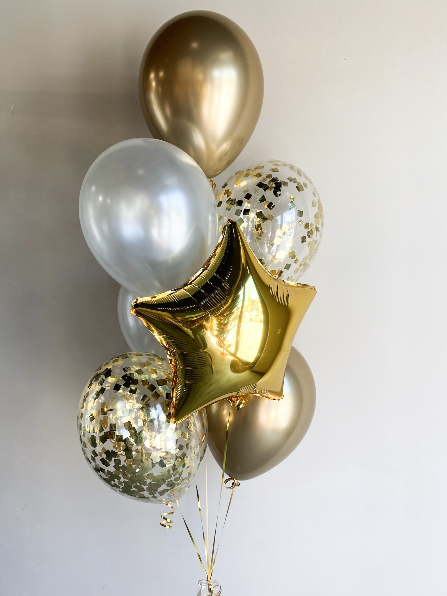 - Фонтан из 7 шаров: звезда, 2 с конфетти, 2 хром, 2 однотонных