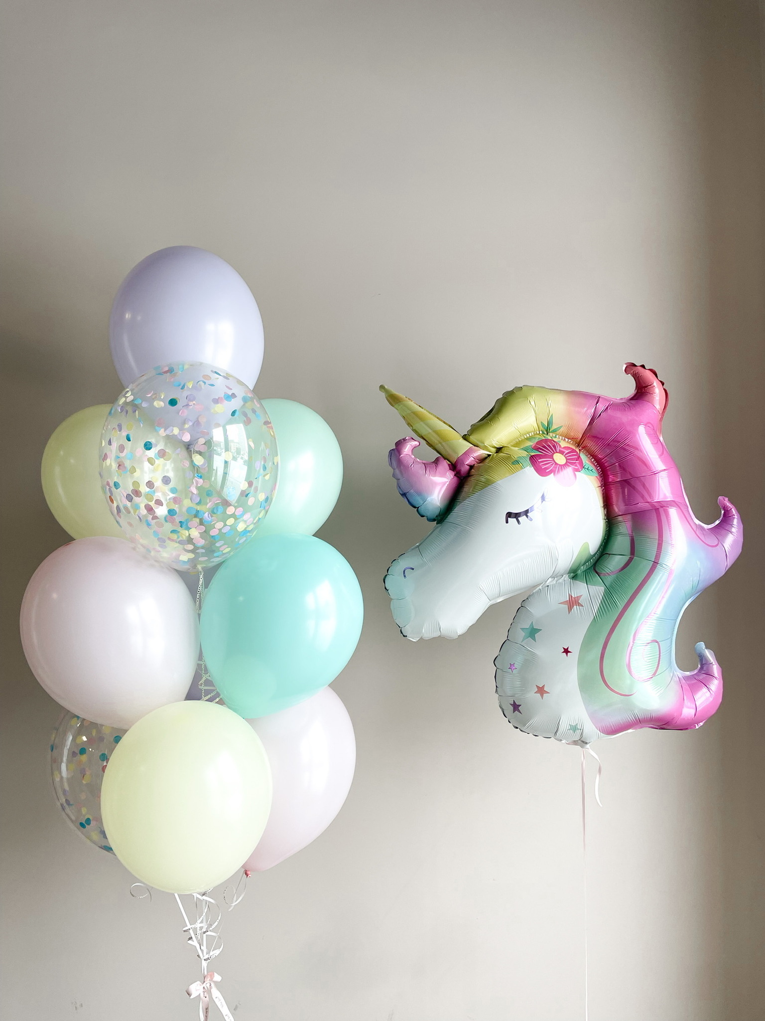- Фонтан из 10 шаров: 2 с конфетти и 8 однотонных.