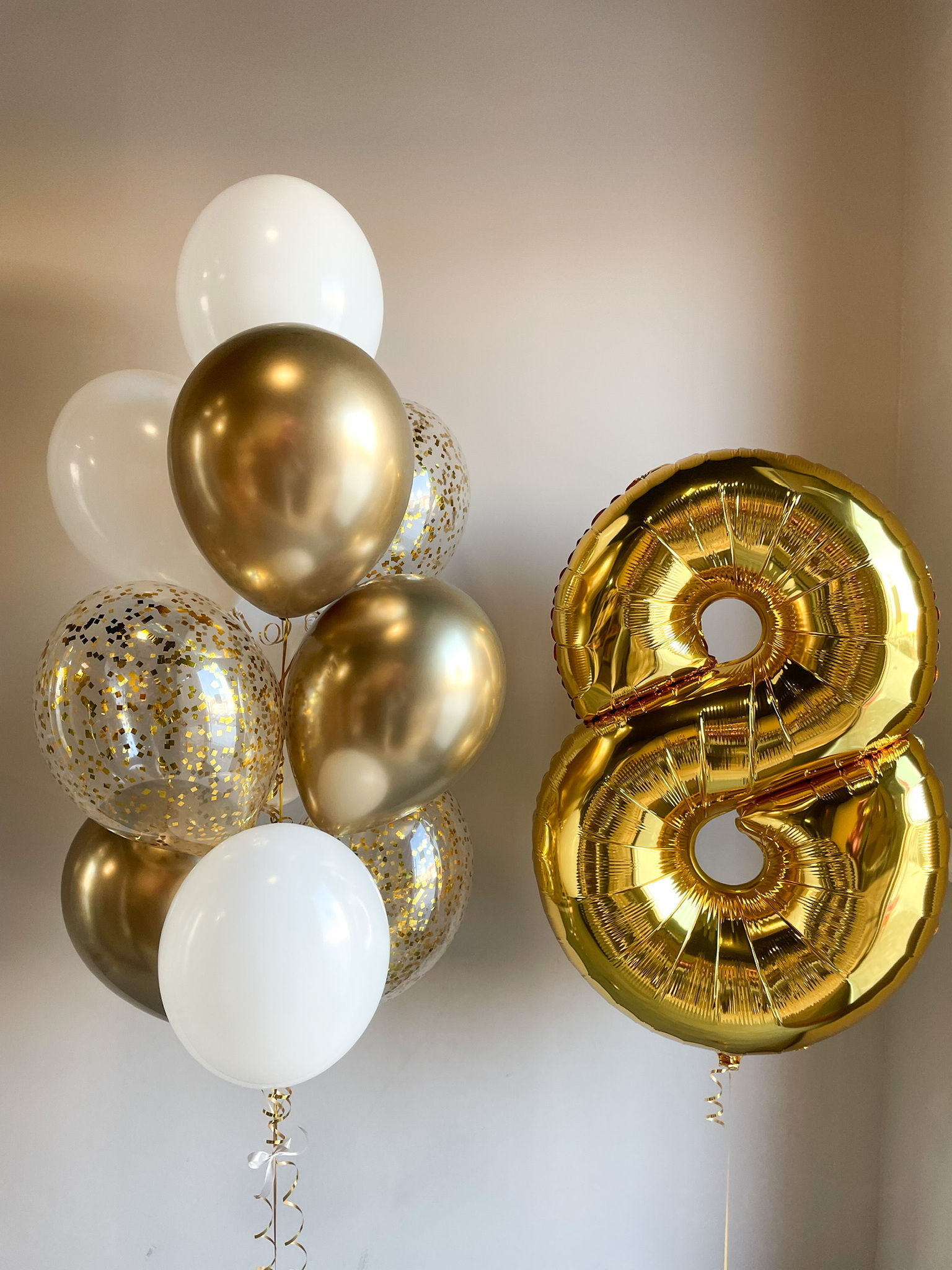 - Фонтан из 10 шаров: 3 с конфетти 3 хром и 4 однотонных.